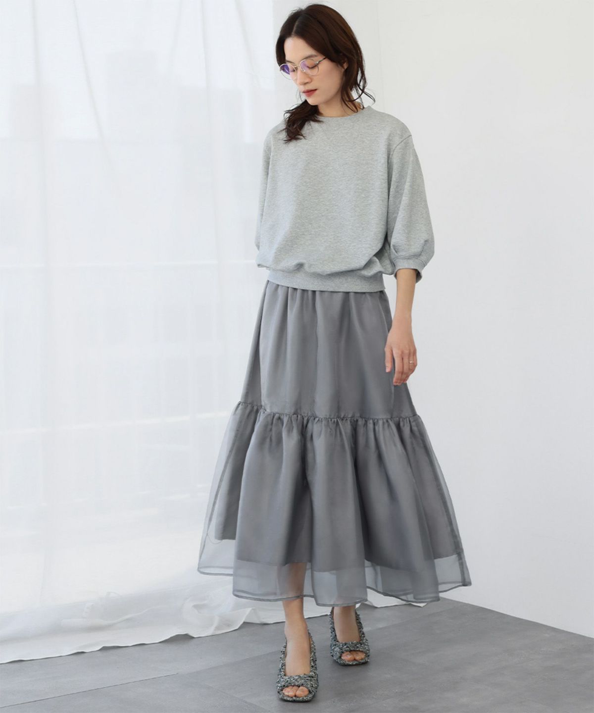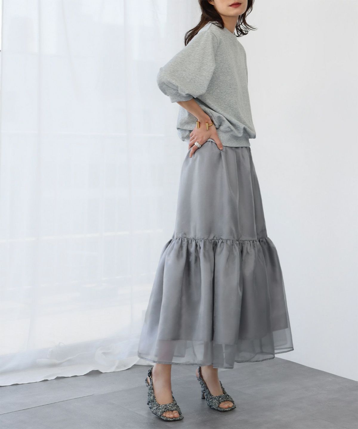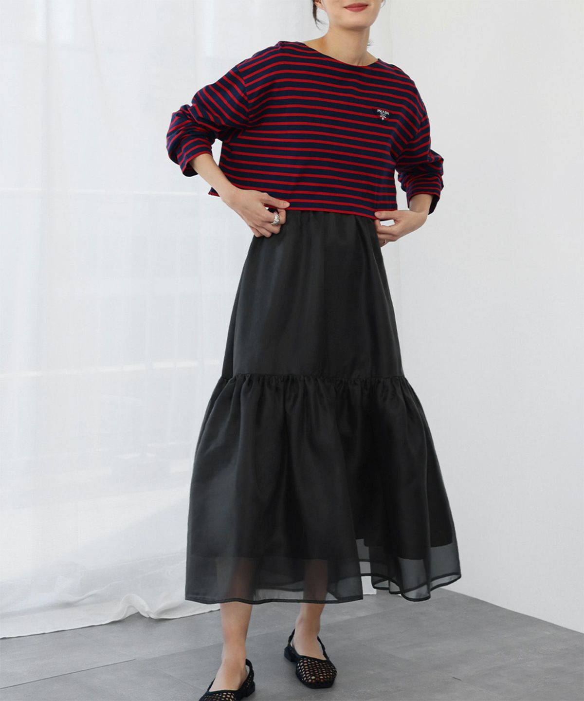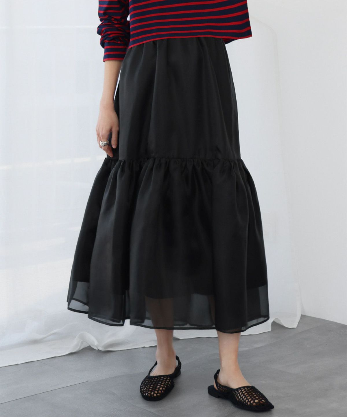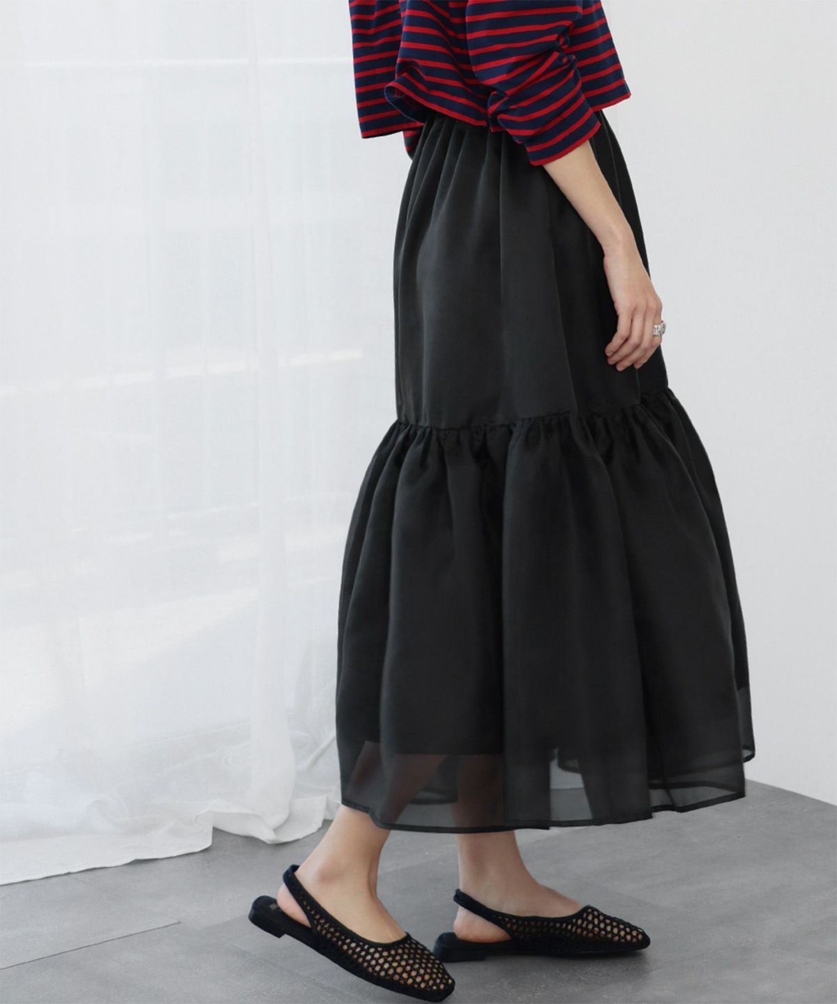 ELFRANK(エルフランク) タフタギャザーボリュームフレアミモレ丈スカート Washable