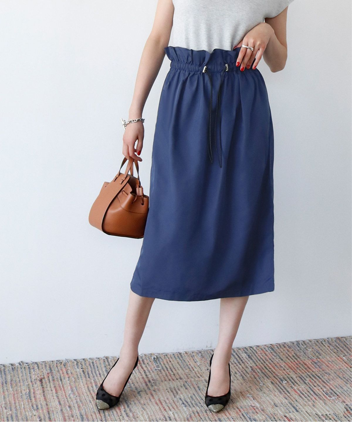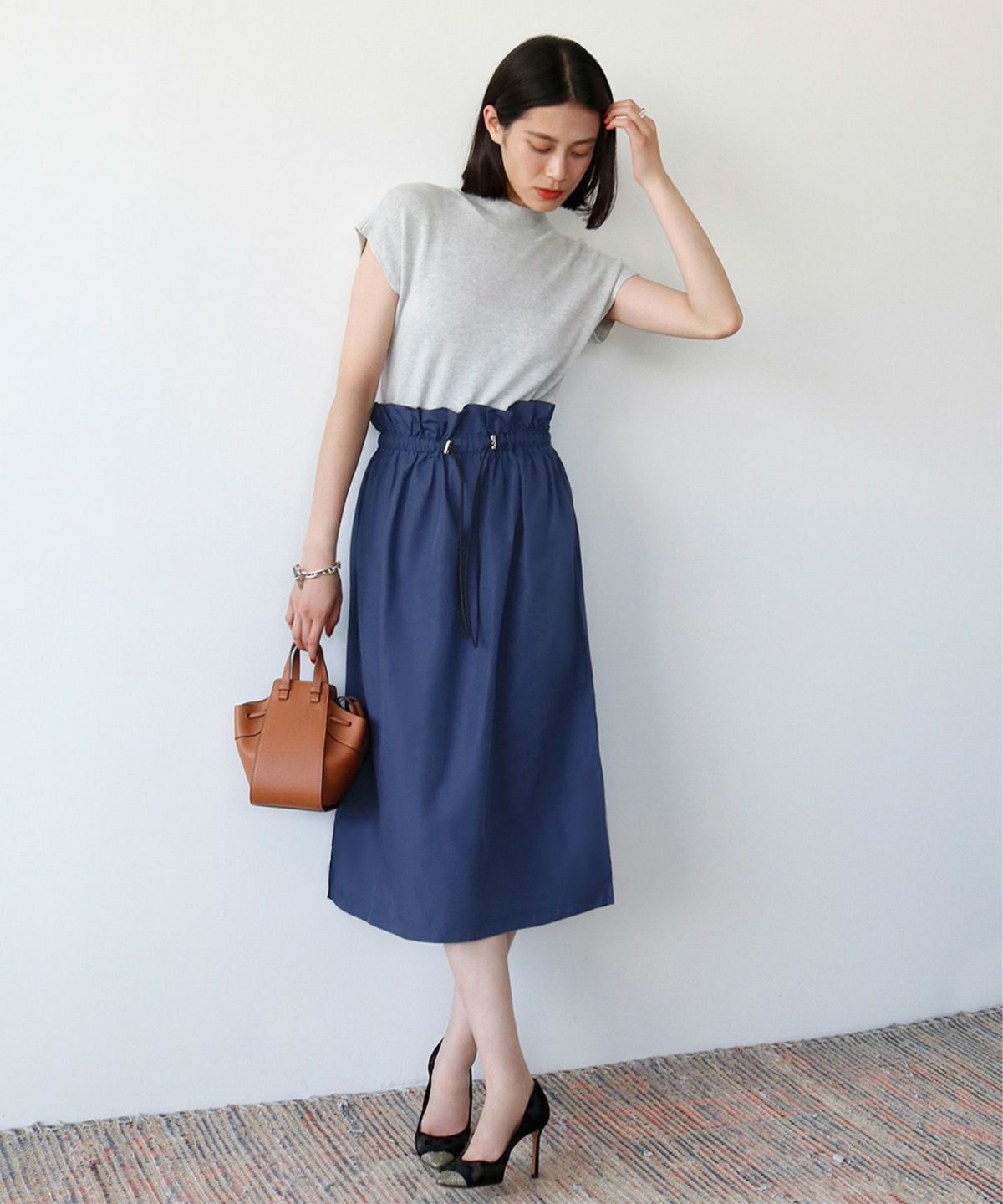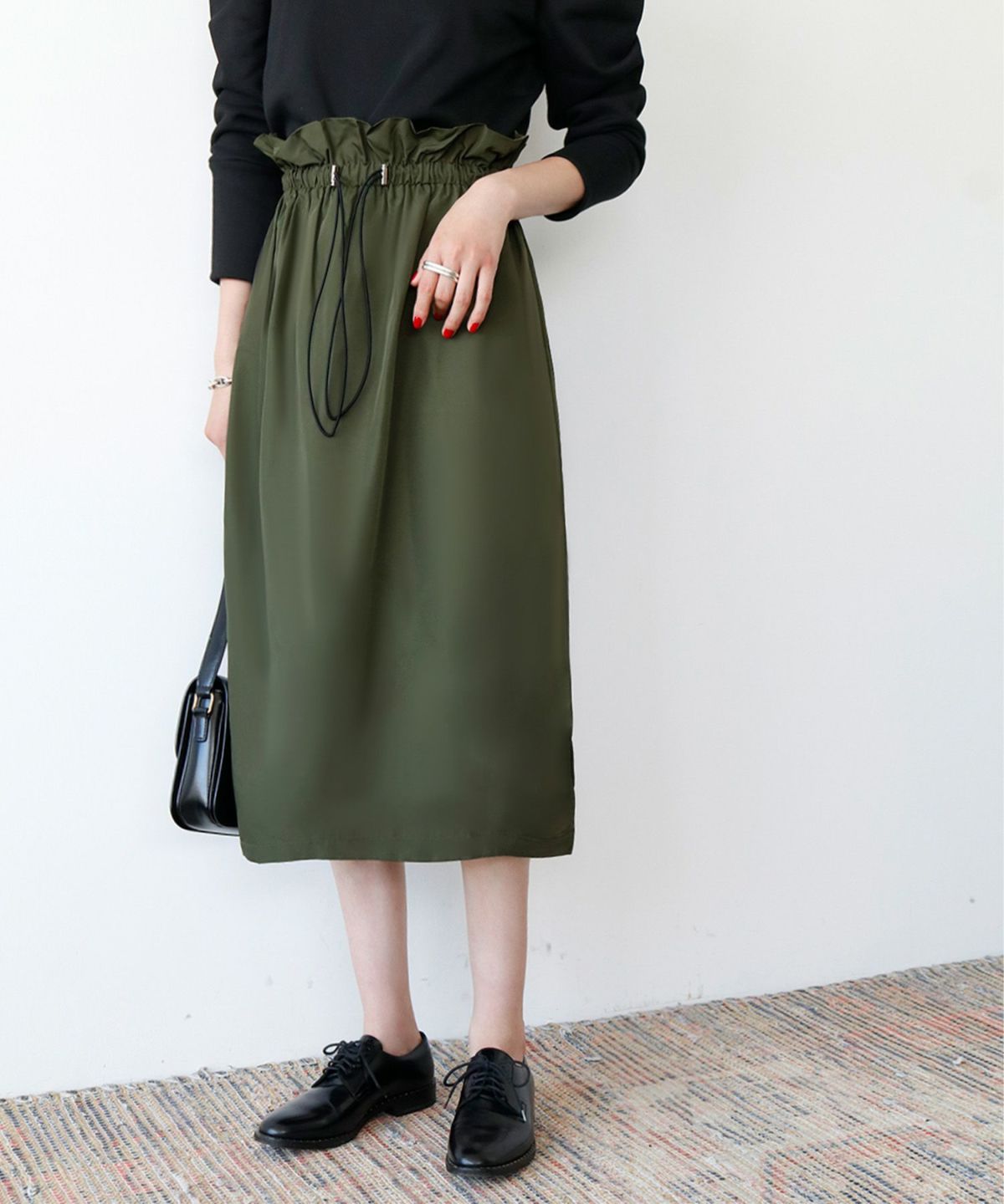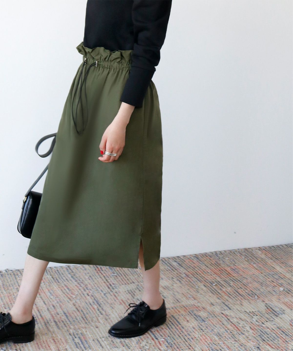 足元がきれいに見えるミモレ丈で、トップスをインしてバランスよく着るもよし、オーバーサイズのニットを合わせてボリューム感を楽しむのも◎ 。