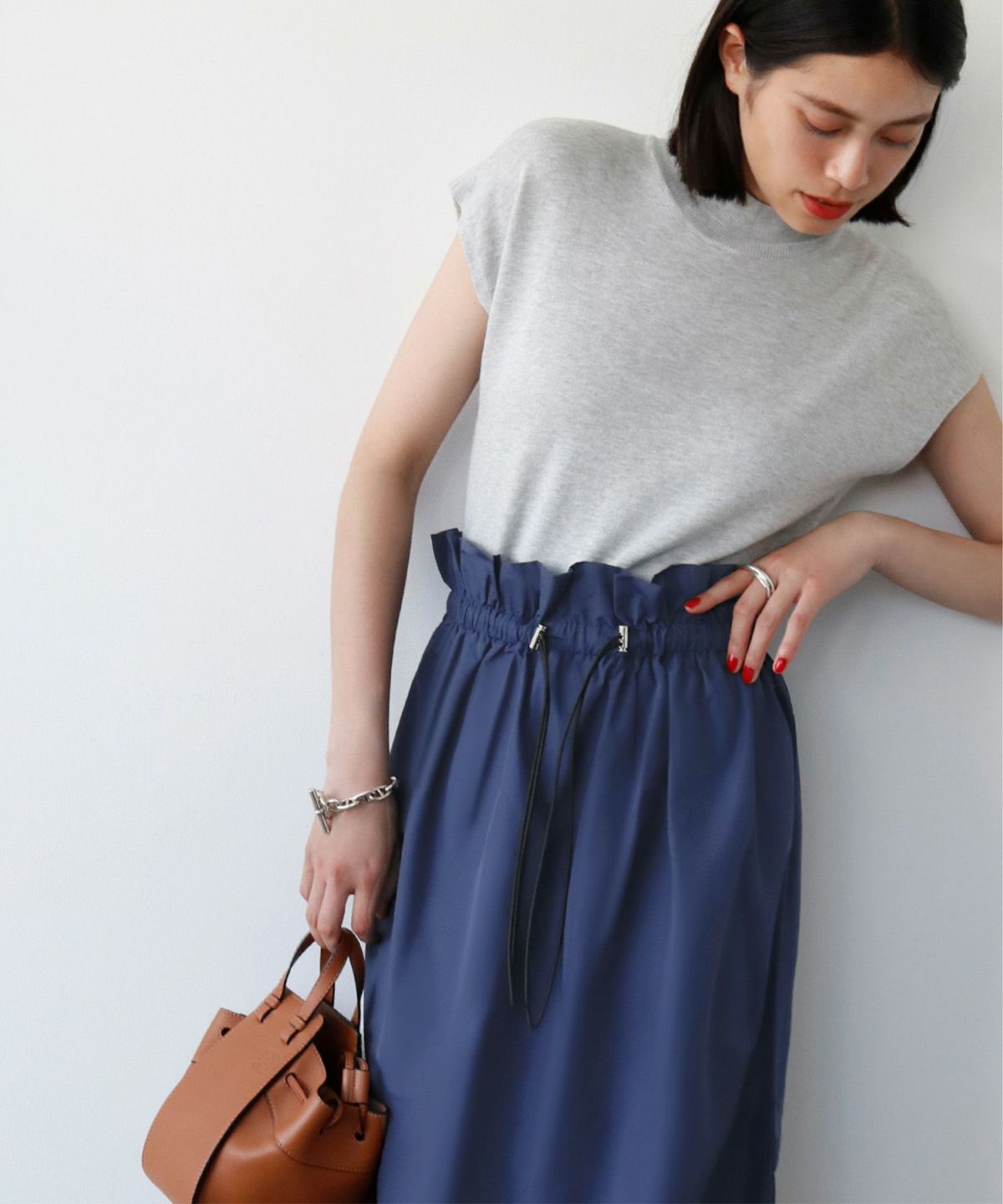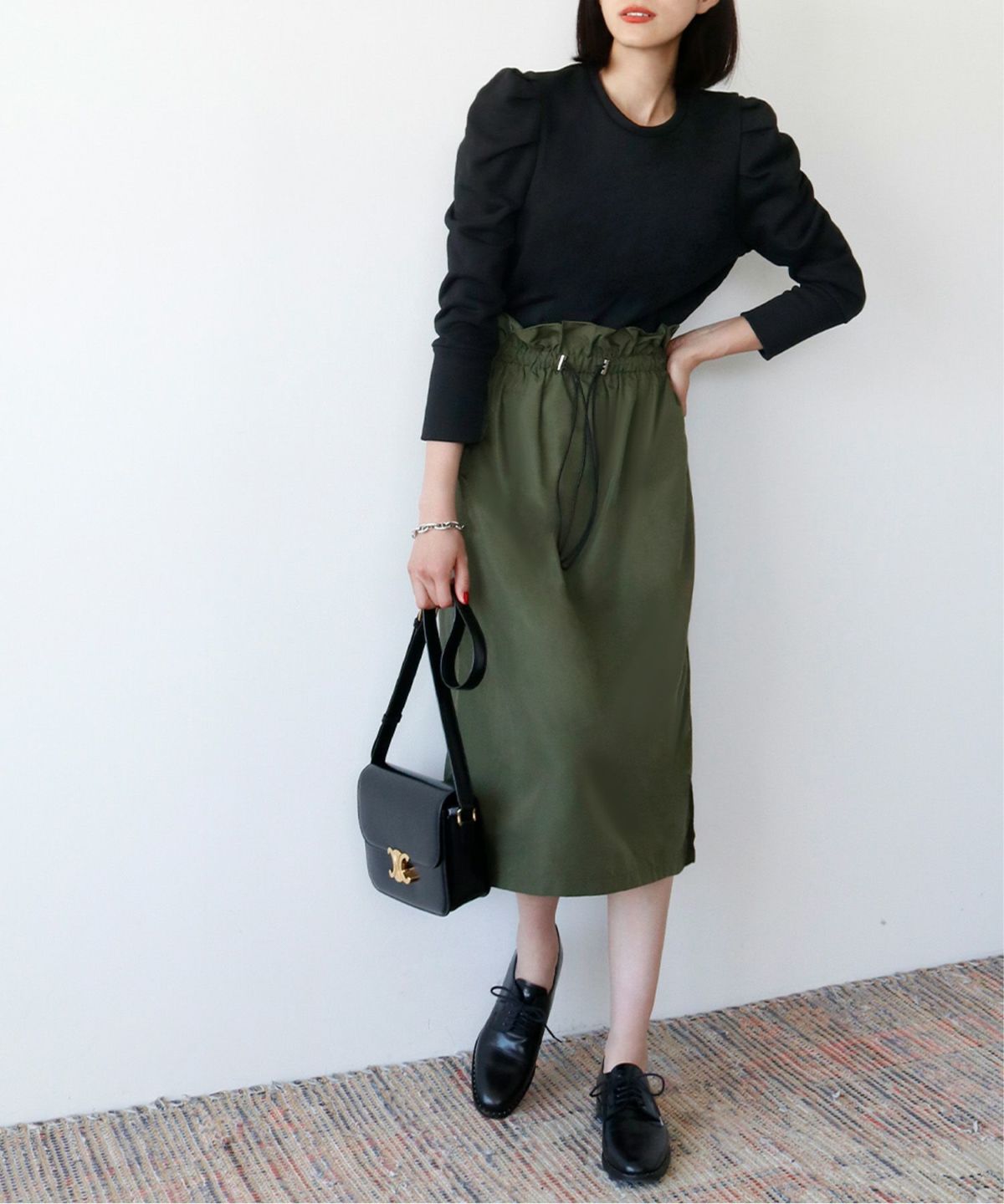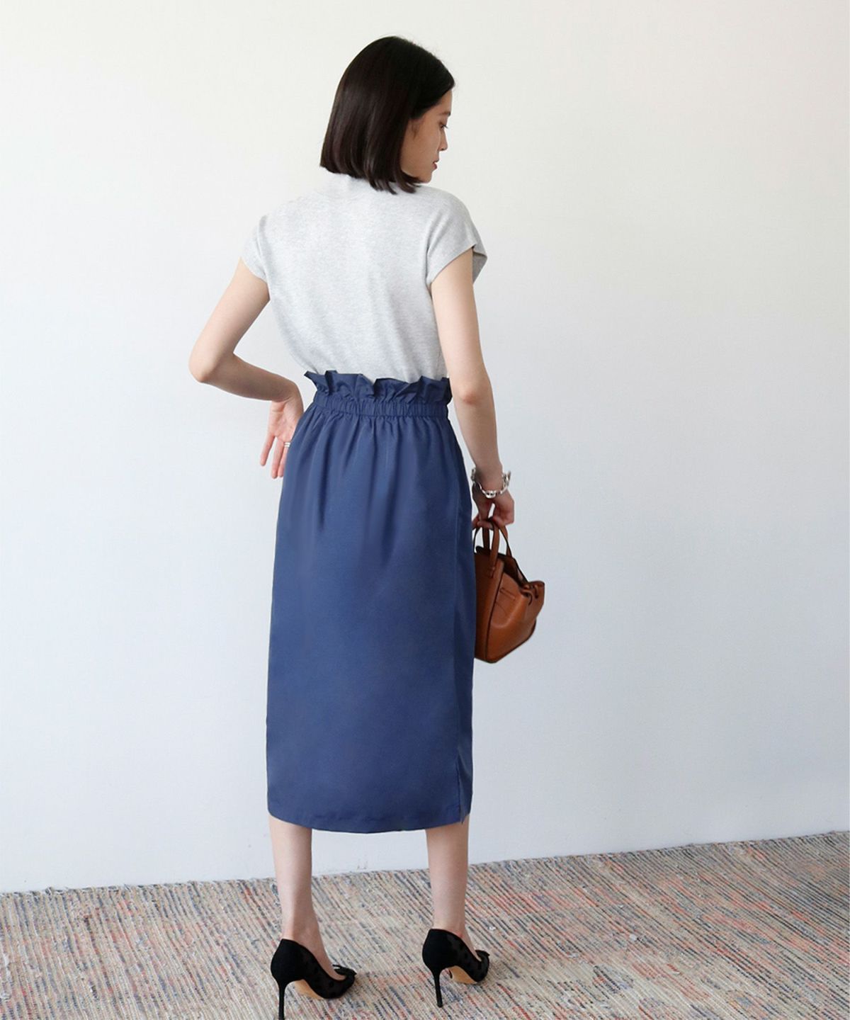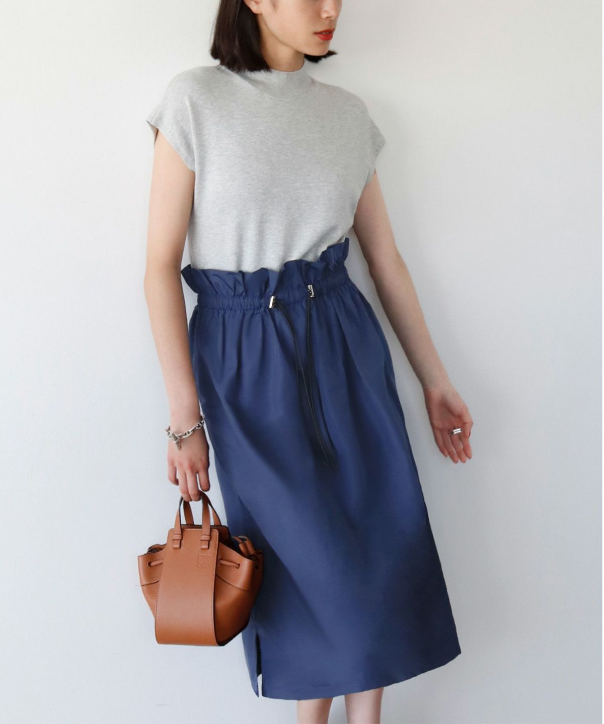 足元がきれいに見えるミモレ丈で、トップスをインしてバランスよく着るもよし、オーバーサイズのニットを合わせてボリューム感を楽しむのも◎ 。