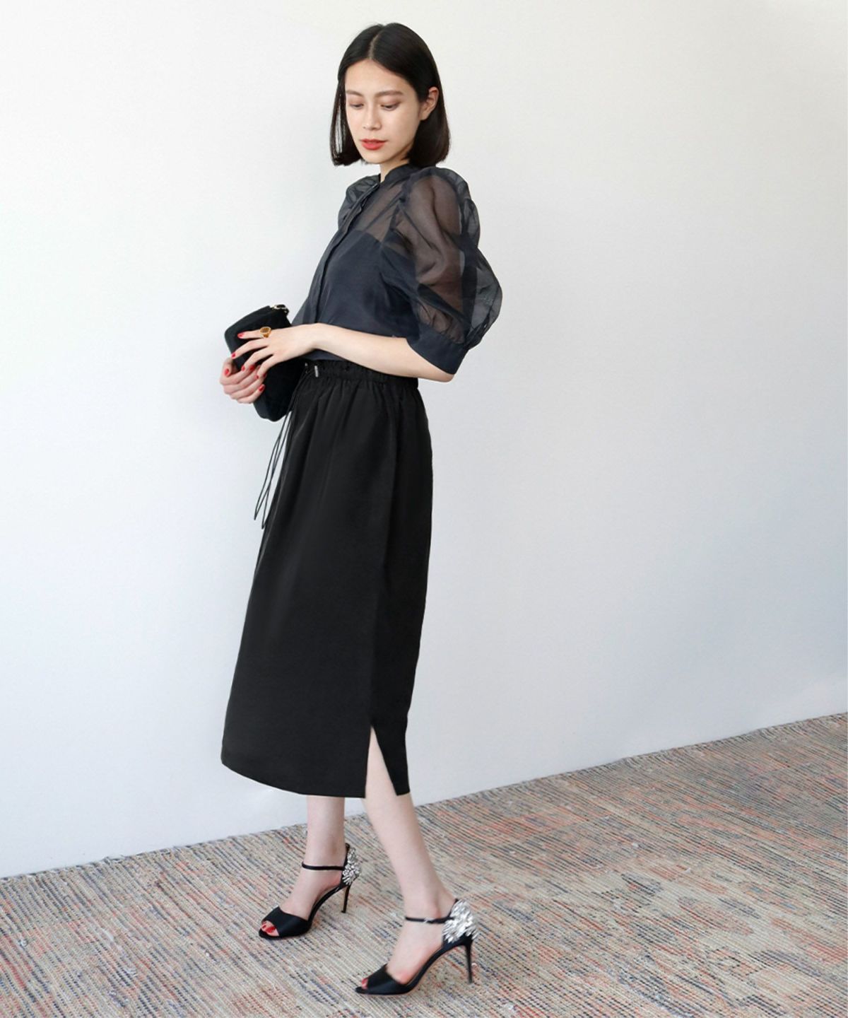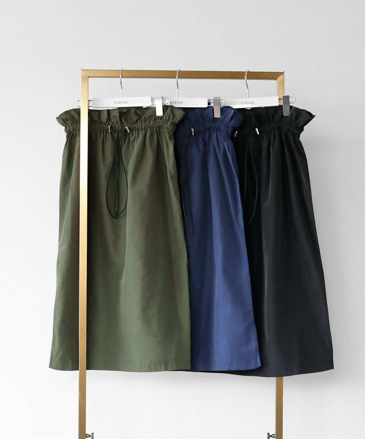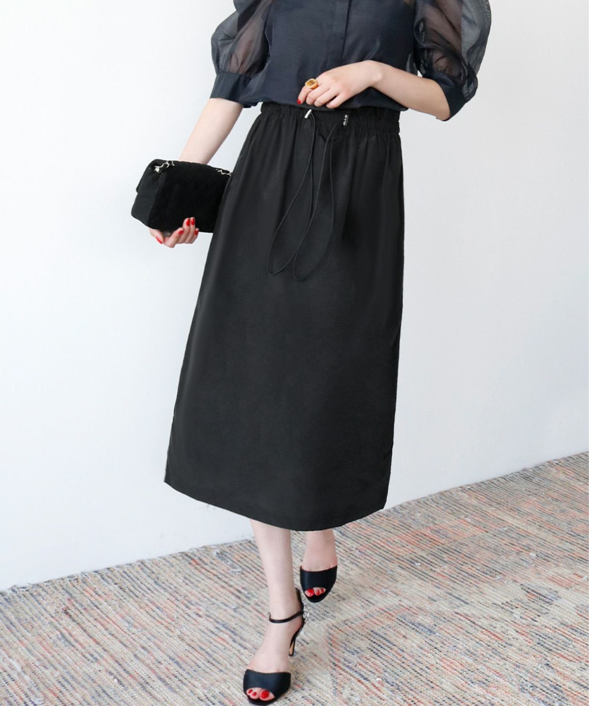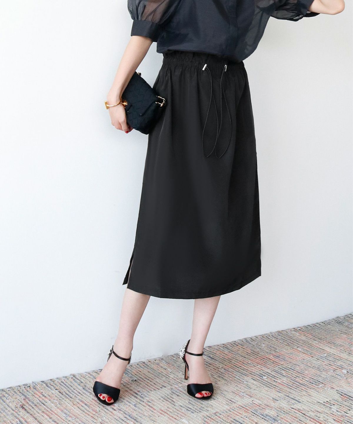 程よいミモレ丈は足首を華奢に美しく見せます。ウエストがゴム入りなので着脱も楽。