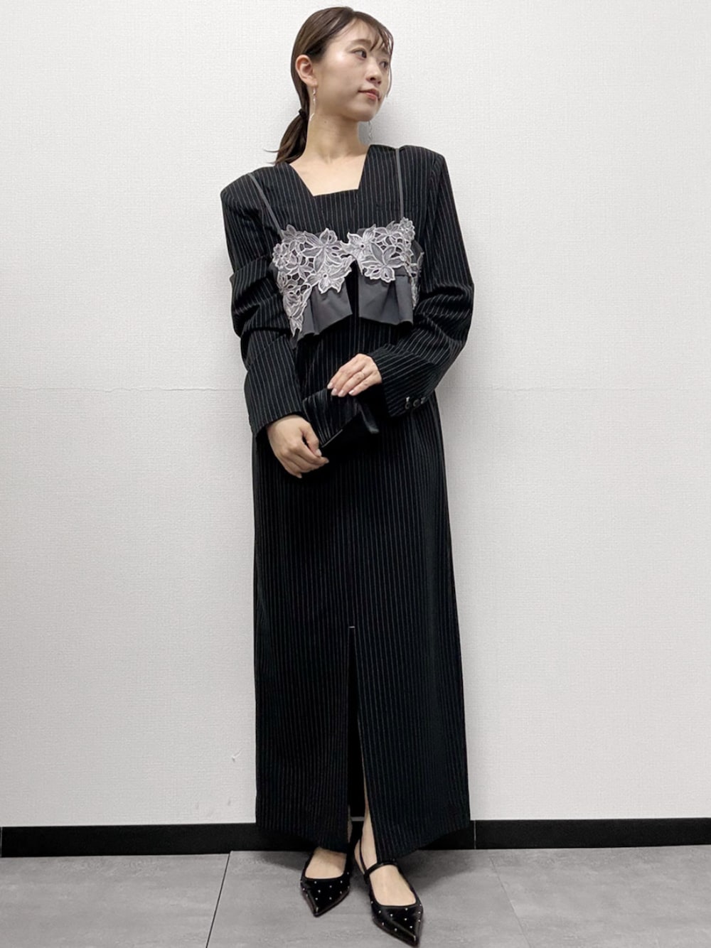 - 【ANDRESD】ピンストライプロングワンピース フリルビスチェ 2点セット結婚式ワンピースパーティードレス