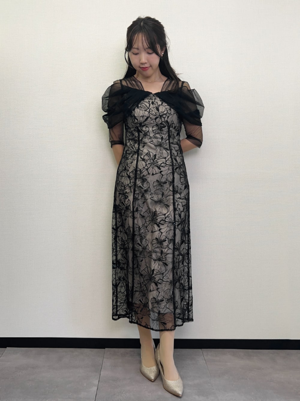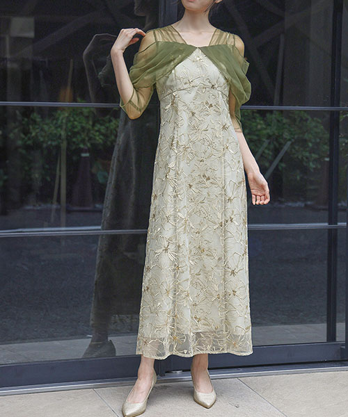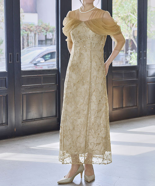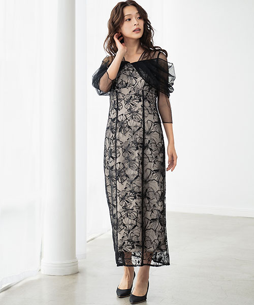 4. 【ANDRESD】フラワー刺繍レース×チュールドレープスリーブIラインロング丈ワンピースパーティードレス