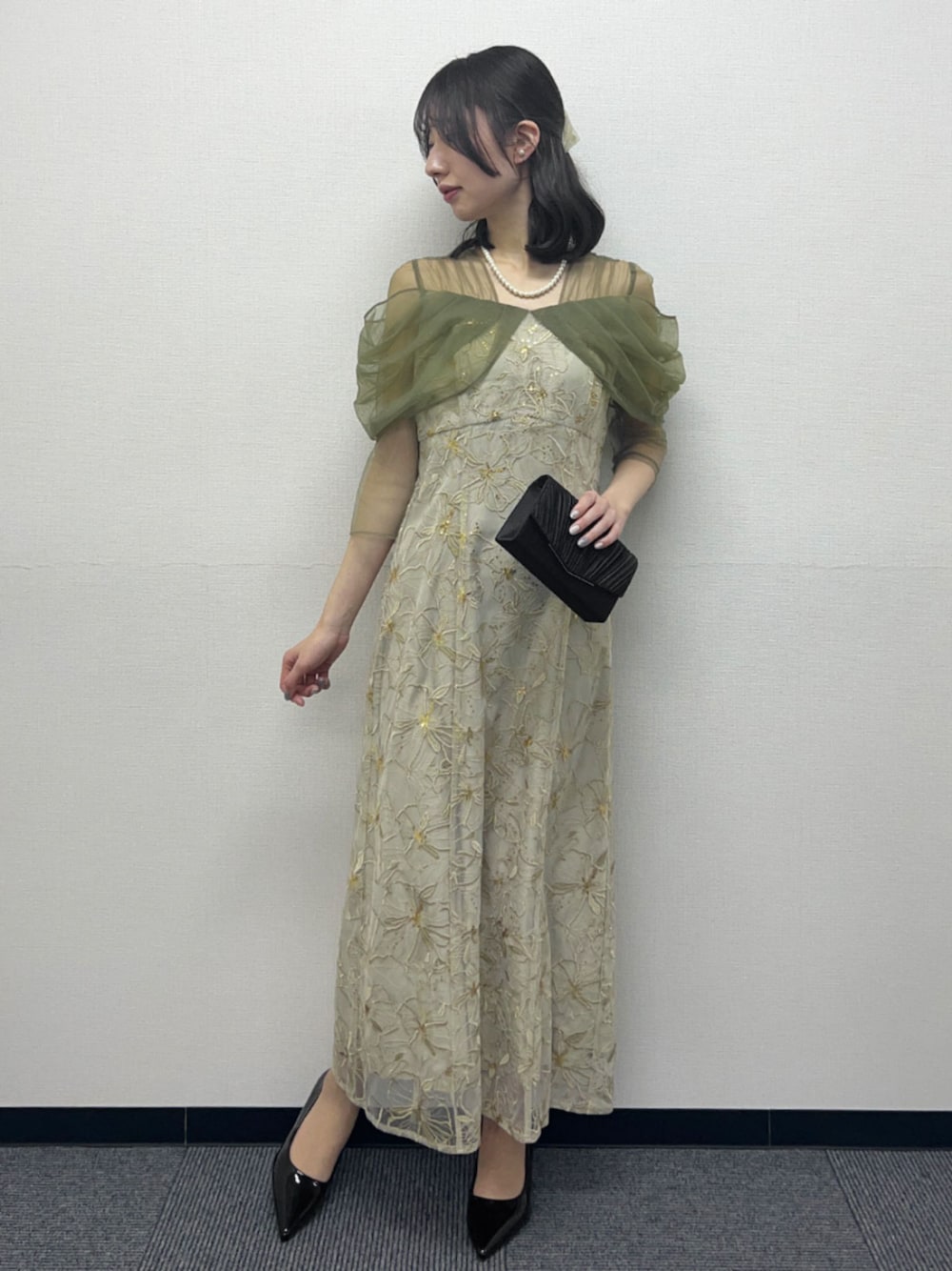 5. 【ANDRESD】フラワー刺繍レース×チュールドレープスリーブIラインロング丈ワンピースパーティードレス