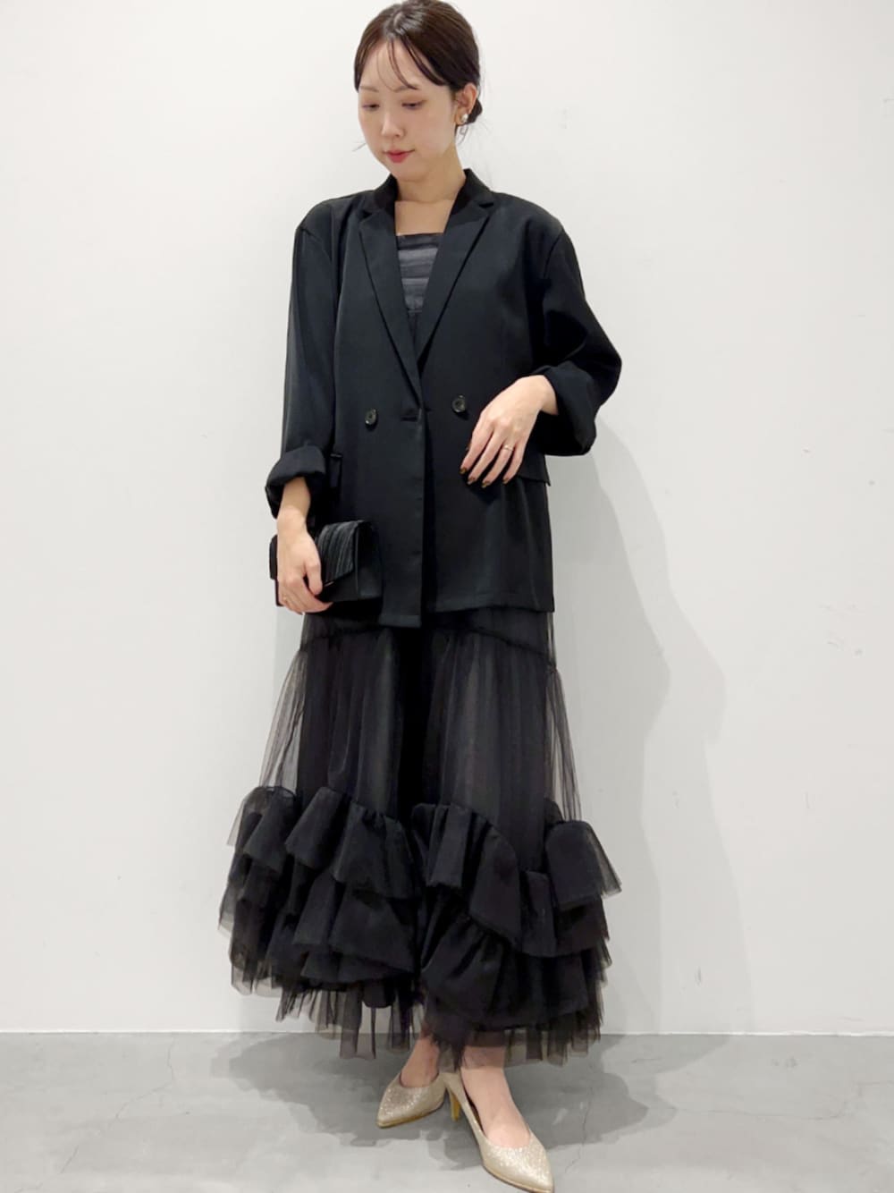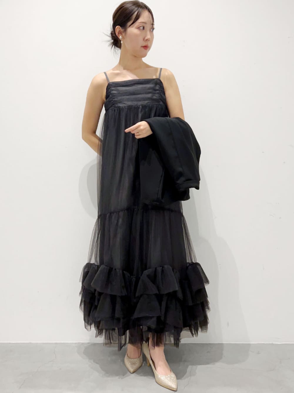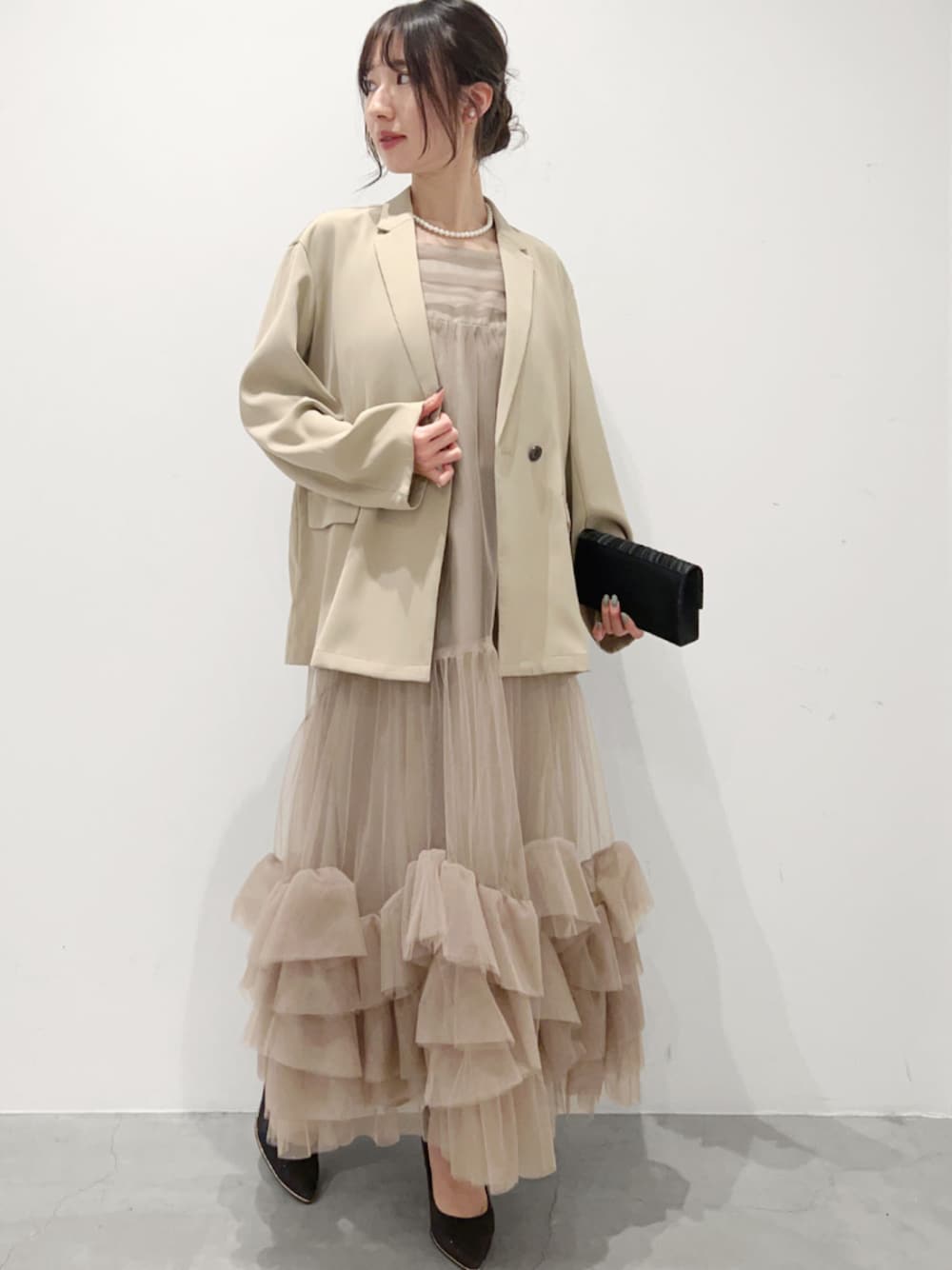 裾にたっぷりフリルをあしらったチュール素材のキャミワンピースと、ジャケットを組み合わせたセットアイテム。