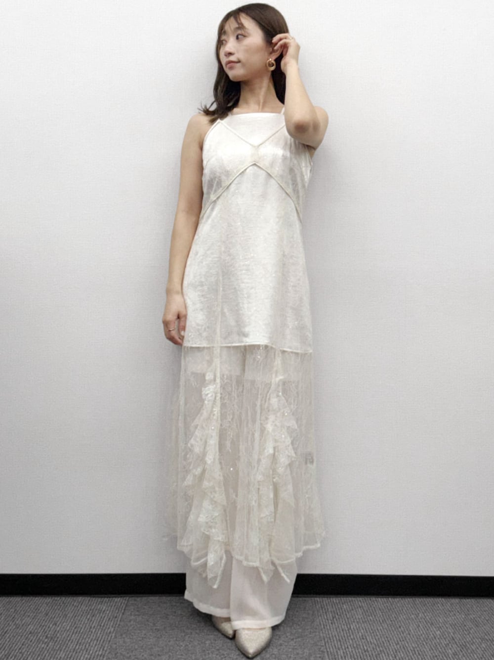 キャミワンピは裾に無地チュールの三角マチとラッフルフリルをあしらい、動くたびに華やかな揺れ感を演出。