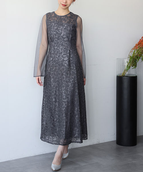 動くたびさりげなく輝くスパンコール刺繍とレイヤード風のバックスタイルが目を引く 抜け感のある華やかな刺繍ドレス。