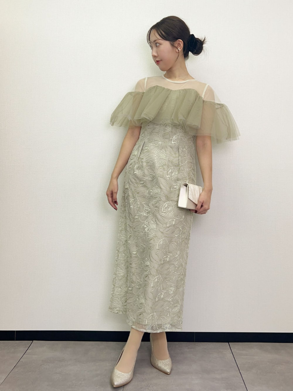 トップにあしらったフリルはハリのあるチュールでボリュームを引き立てオフショル見えのデザインに。