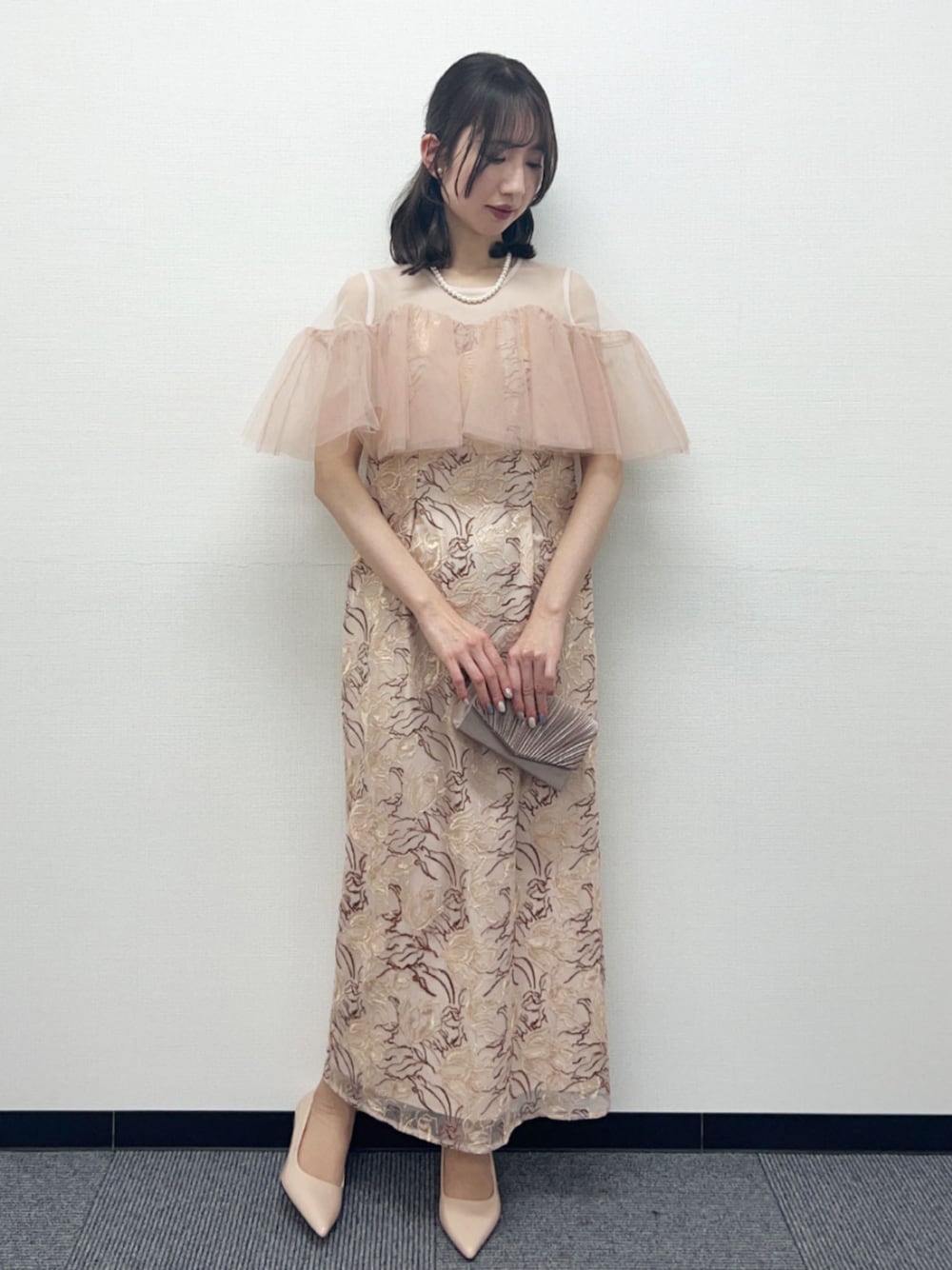 4. 【ANDRESD】チュールフリルオフショル風スリーブ×レース刺繍ロングワンピースドレス