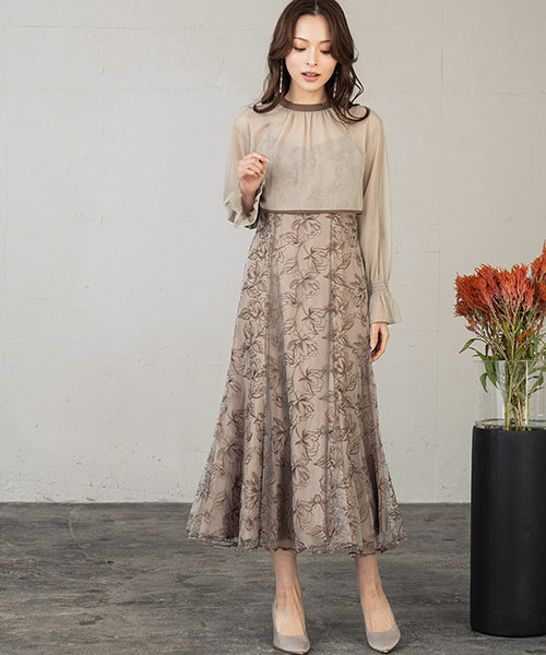 ワンピースは大きめのフラワー刺繍で華やかさアップ。