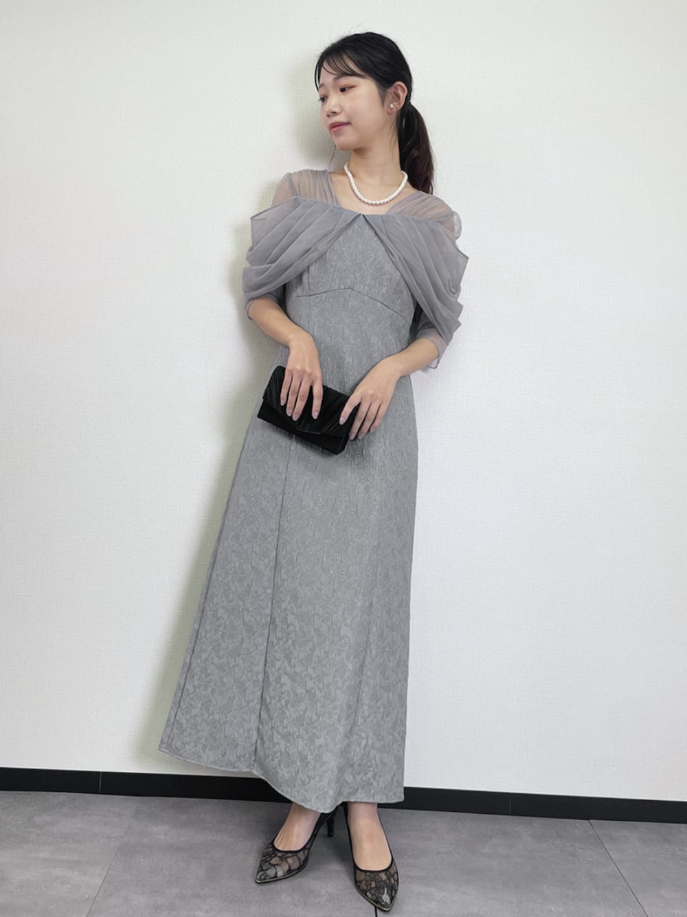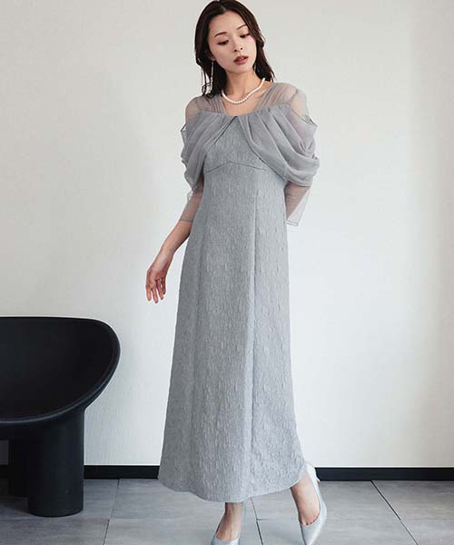 デコルテ部分はオフショルダー風のデザインに仕上げ、異素材を組み合わせることでさりげない抜け感と奥行きをプラスしました。