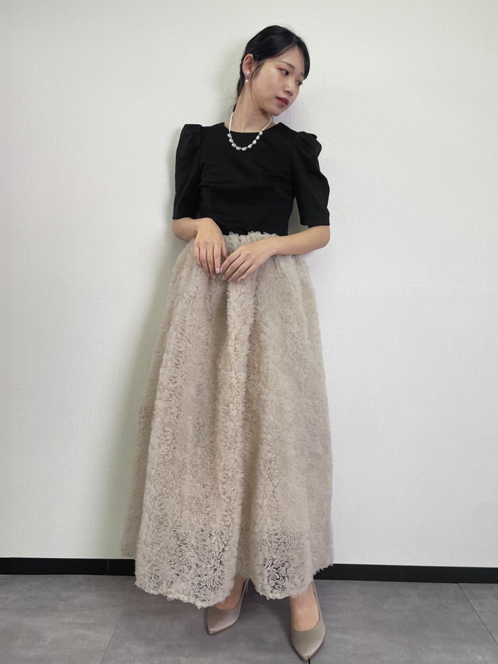たっぷりのチュールを使ったふんわりフラワーチュール刺繍のもこもこスカートに、ぴったりシルエットの5分袖トップスを合わせたセットアップ。