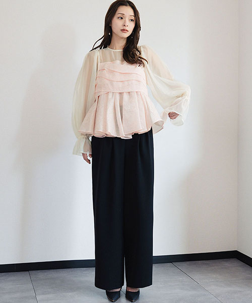 4. シアーボリュームスリーブ刺繍ペプラムトップス&ワイドパンツセットアップドレス