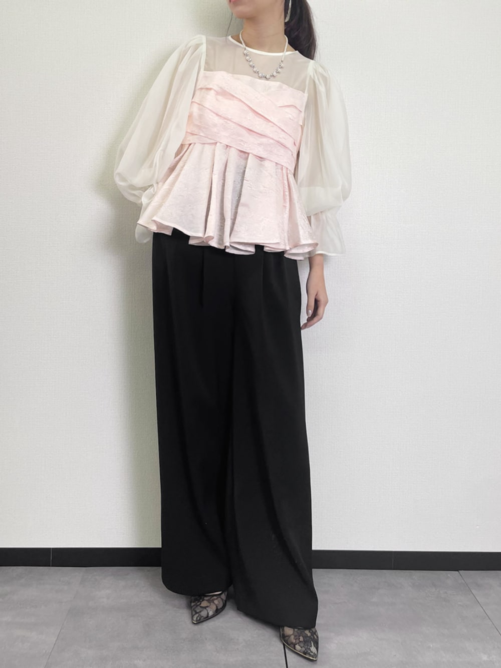 5. シアーボリュームスリーブ刺繍ペプラムトップス&ワイドパンツセットアップドレス