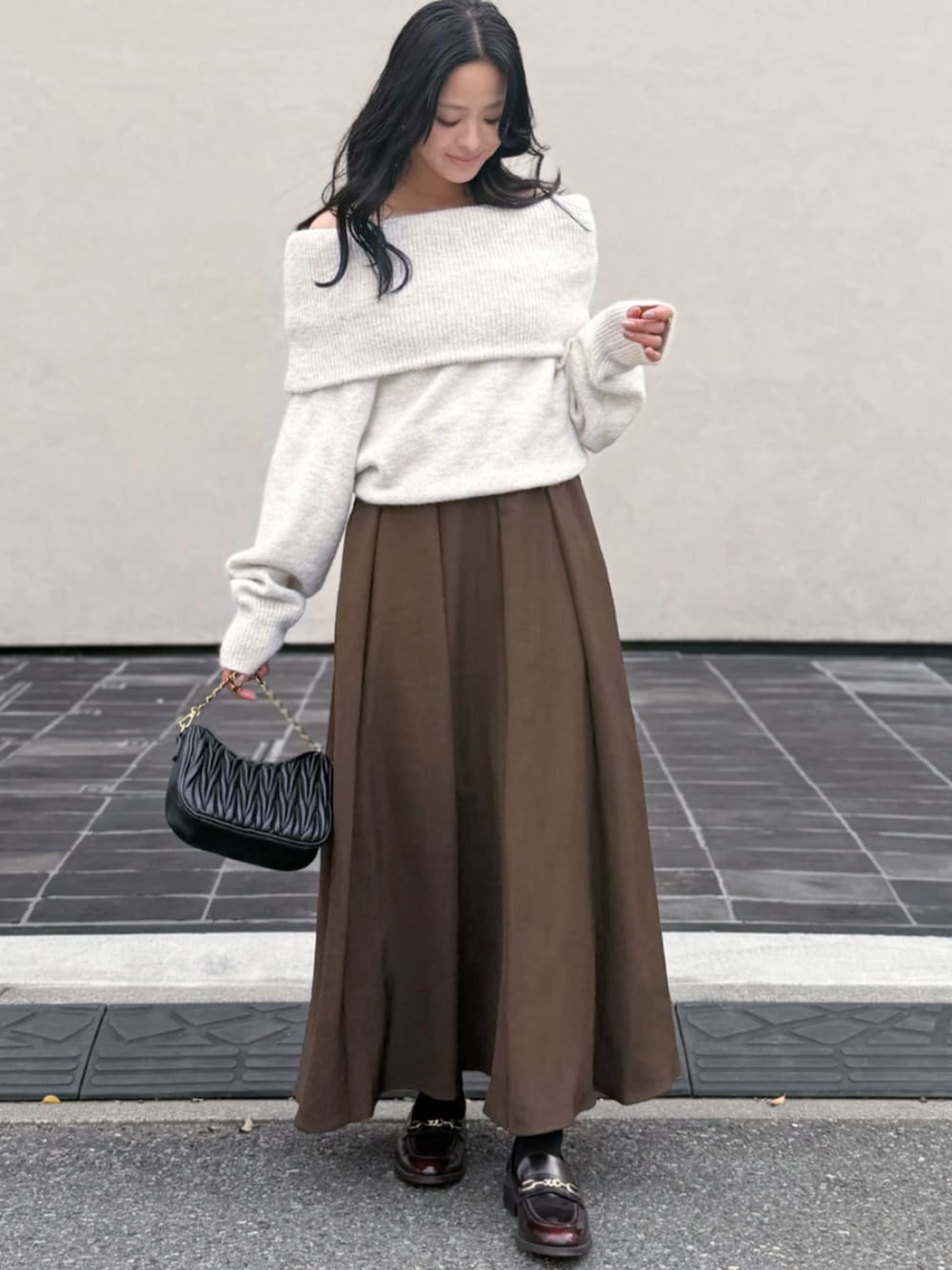大きめのオフショルで小顔効果が期待できます。