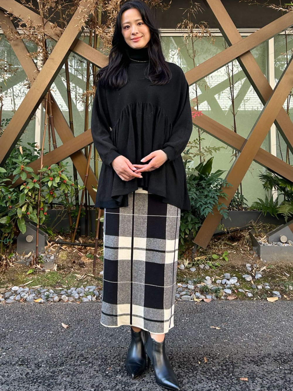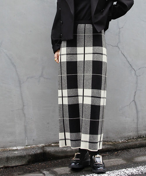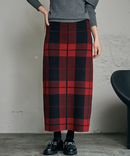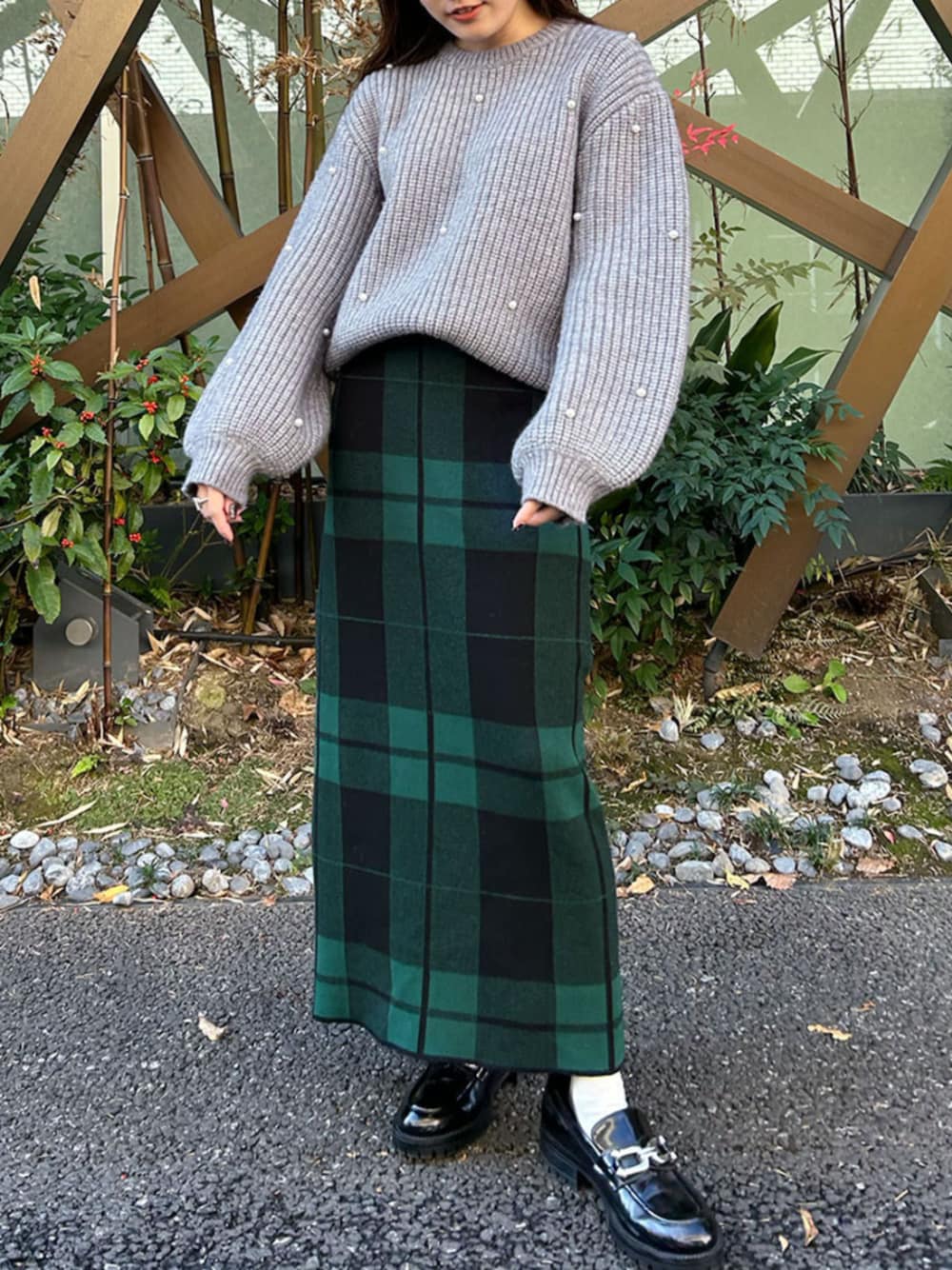 大柄チェックで抜け感のある着こなしができるニットタイトスカート。
