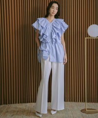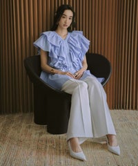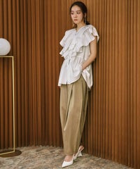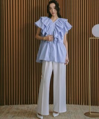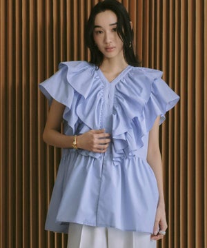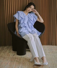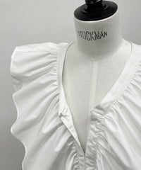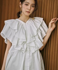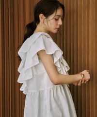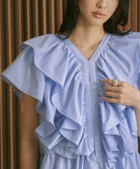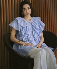 たっぷりのフリルで気になる二の腕をカバーしつつ、前後Vネックの襟もとですっきりとした印象を与えてくれます。