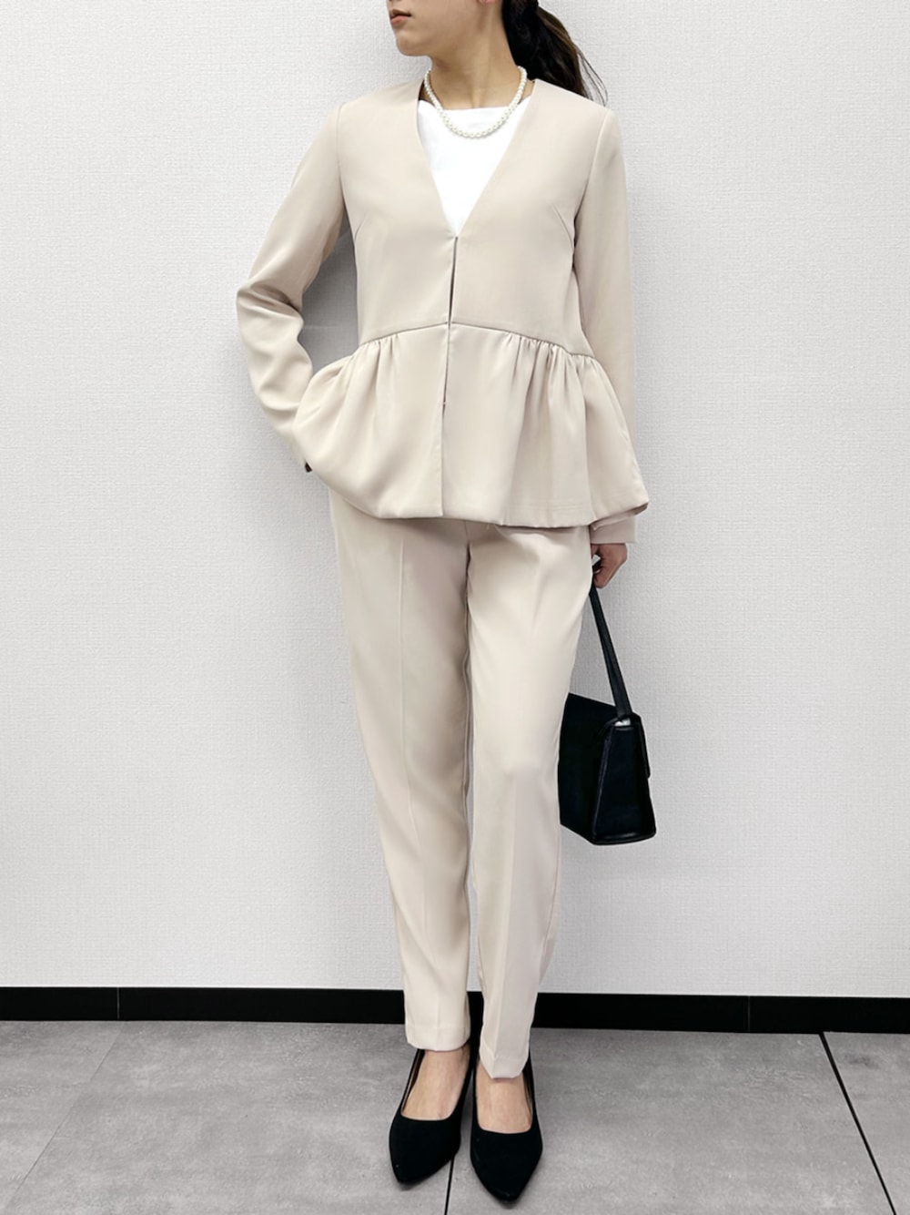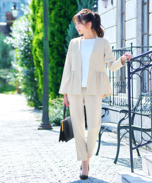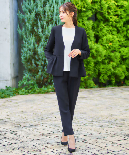ペプラムノーカラージャケットとセンタープレステーパードパンツの2点セットスーツ。