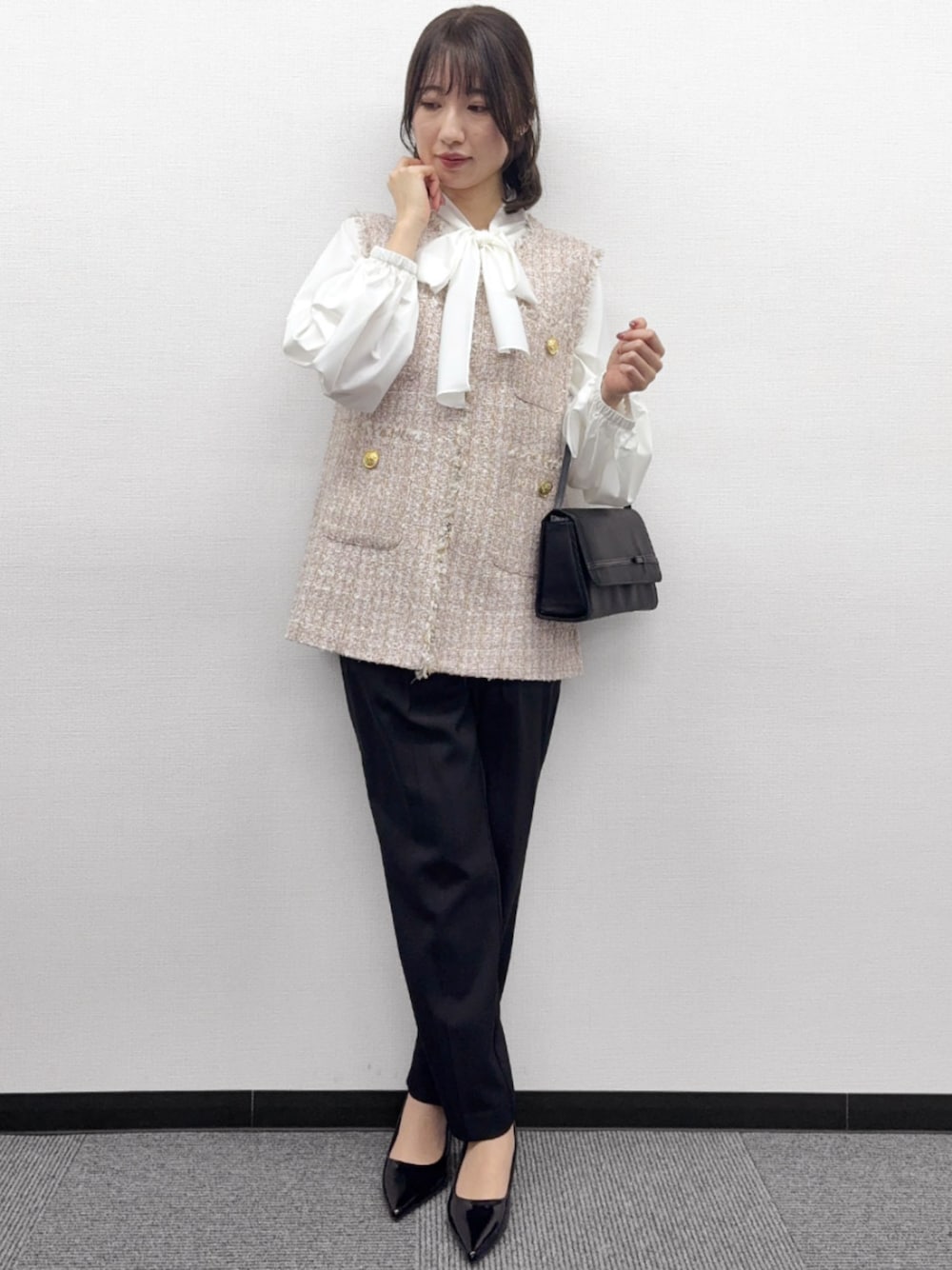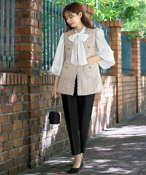 トレンドのジレを華やかなツイード素材で仕上げ、ふんわりとしたボウタイブラウスにテーパードパンツまで付いたお得感のある3点セットアップ。