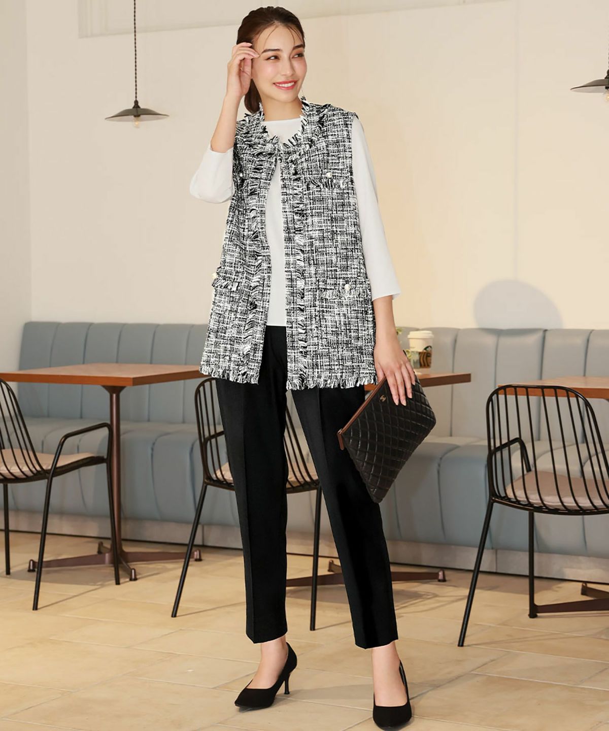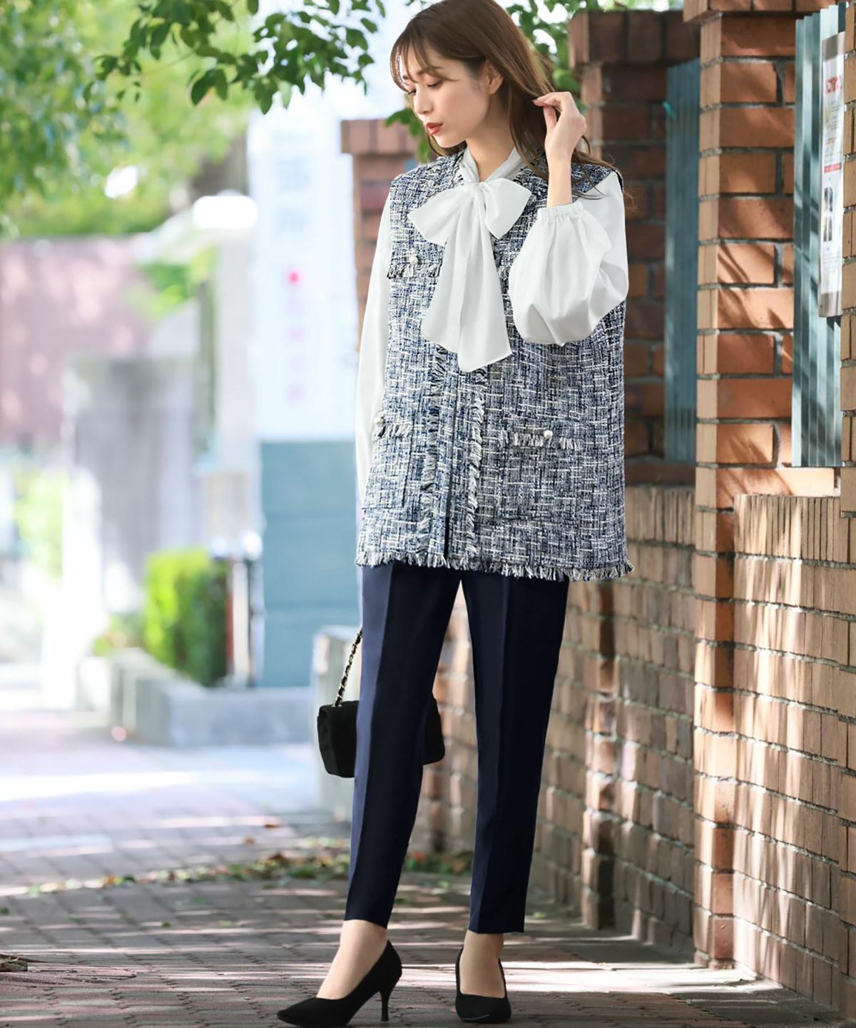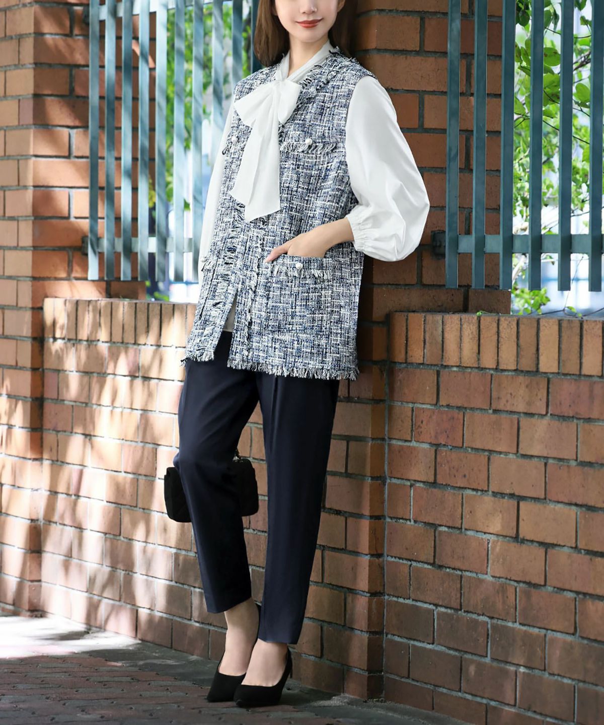 パンツは裾に向かって細くなるテーパードシルエットで、脚長効果・美脚効果が期待できる一枚です。