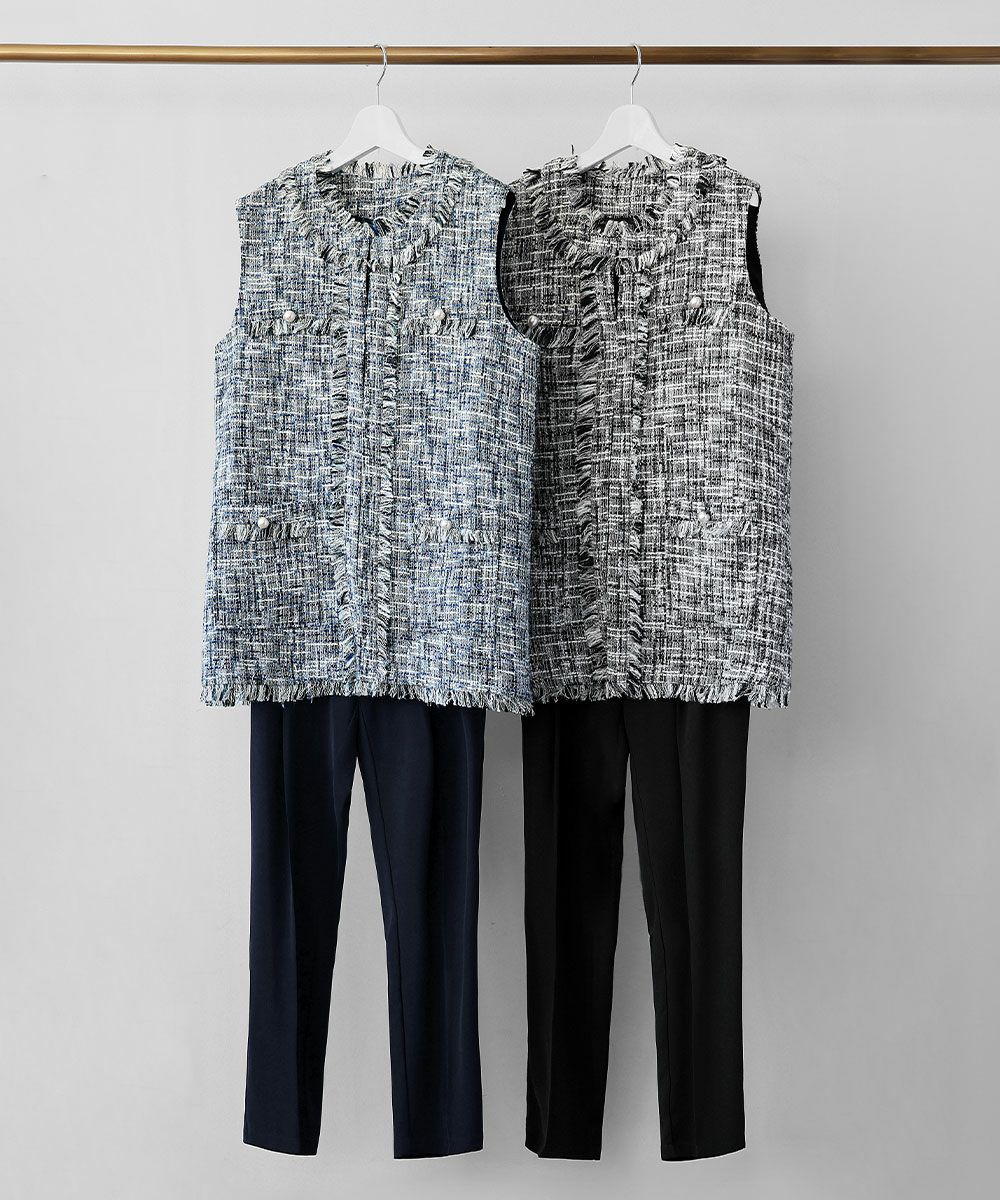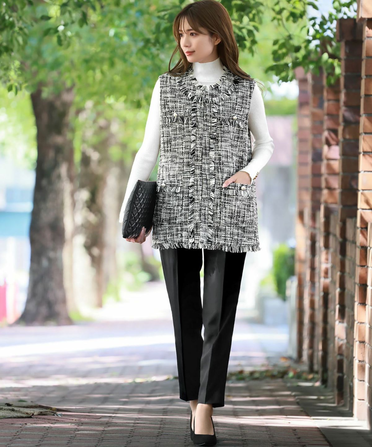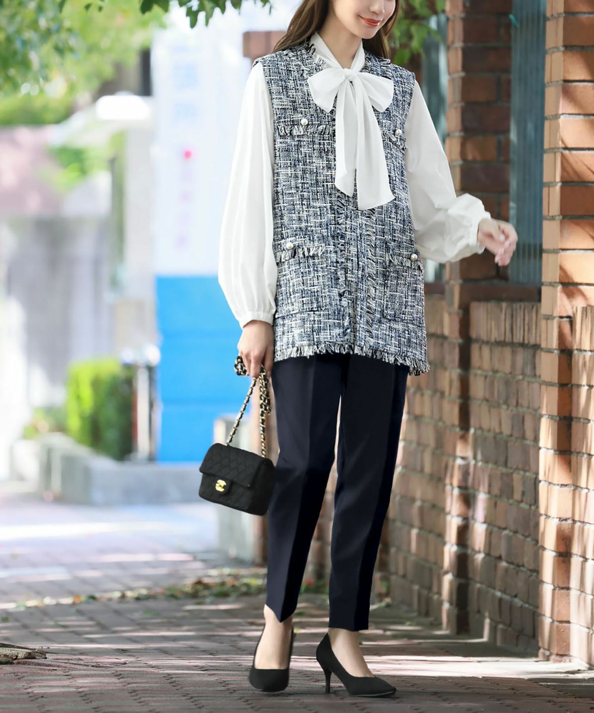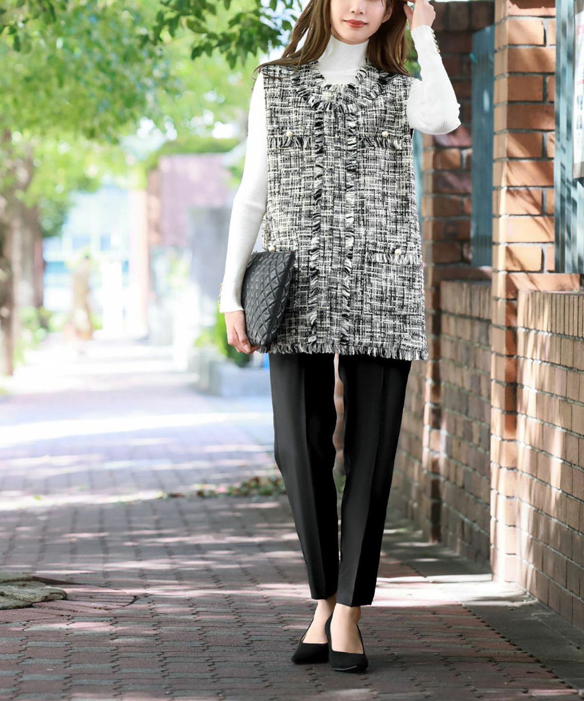 パンツは裾に向かって細くなるテーパードシルエットで、脚長効果・美脚効果が期待できる一枚です。