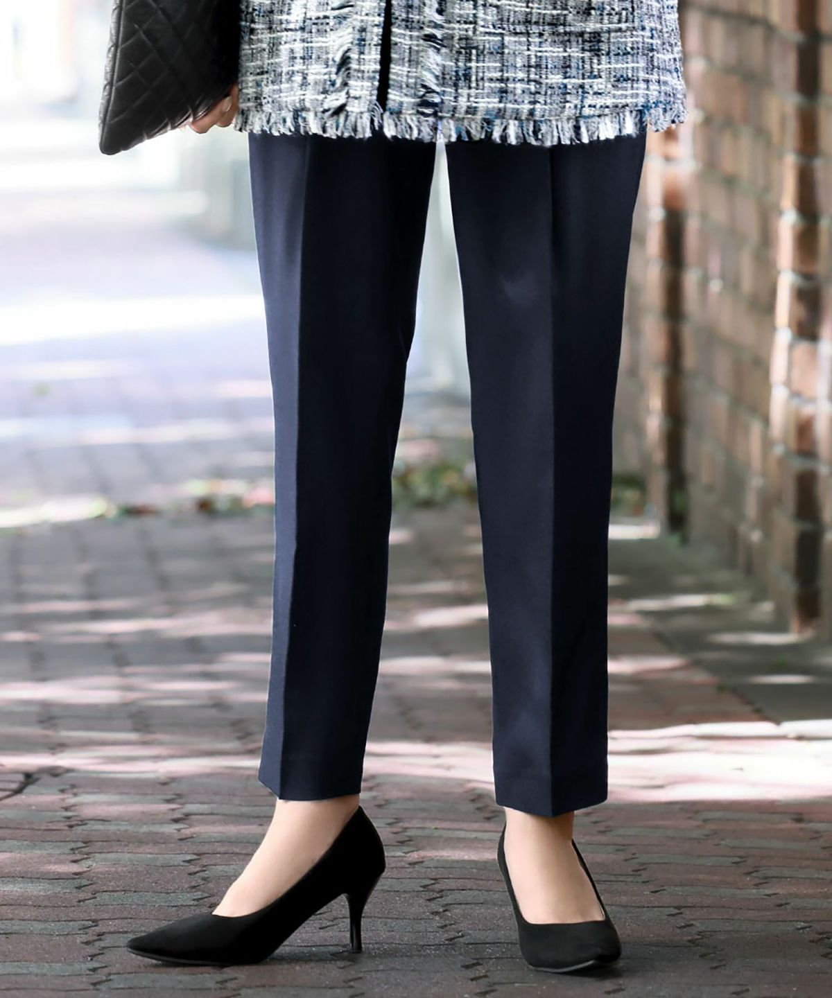 美シルエットのテーパードパンツはヒップから太ももを覆い隠し、足首を華奢見せします。