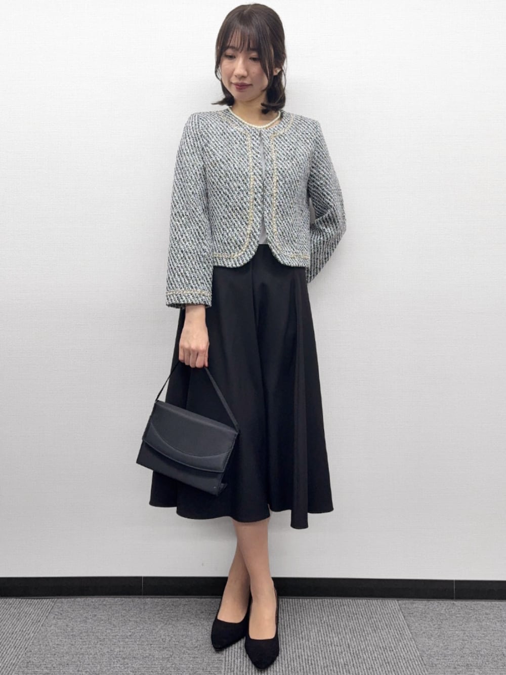 ツイードジャケットとフレアースカートの2点セットアップスーツ。