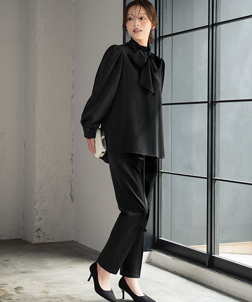 マルチWAYのボウタイにディテールコンシャスなボリュームスリーブが印象的なブラウスと定番人気のテーパードパンツをセットにした2点セットアップスーツです。