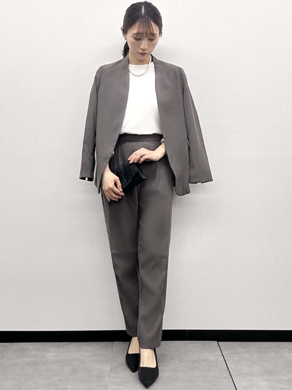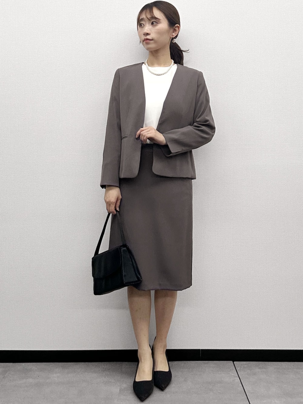 チャコールグレーのスカートを選びました。ジャケットも程よいフィット感。ただ、生地が少し薄めなので、冬場はインナーで調整が必要かも。でも、春秋にはぴったりで高見えするので満足しています。