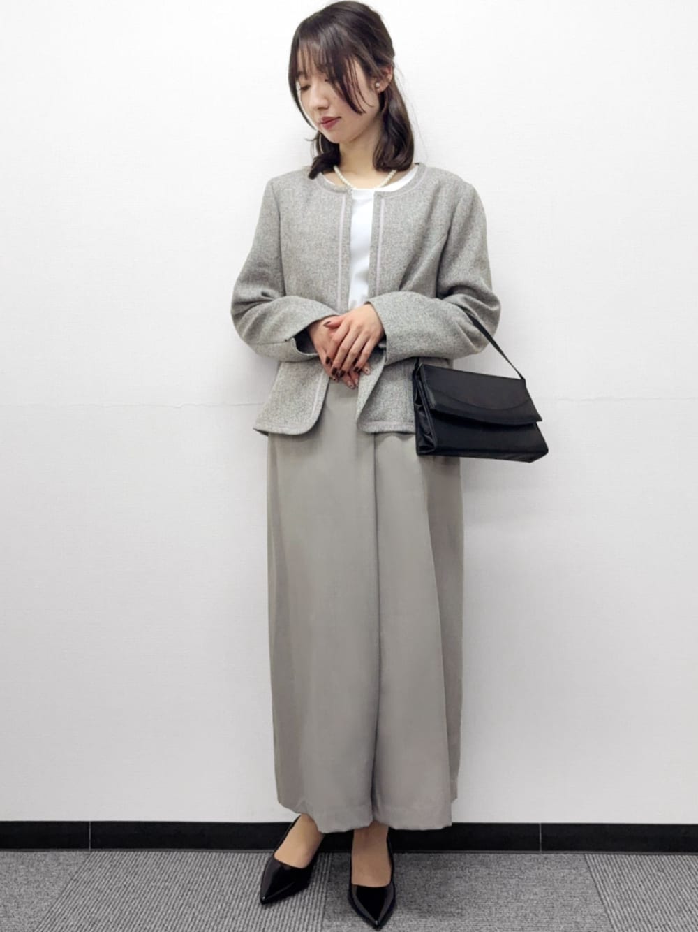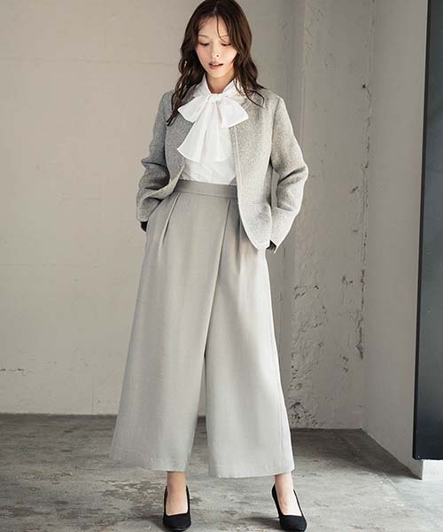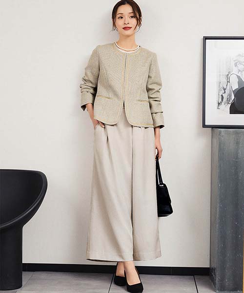 5. ノーカラーツイードジャケット&巻きスカート風ワイドパンツ2点セットスーツ