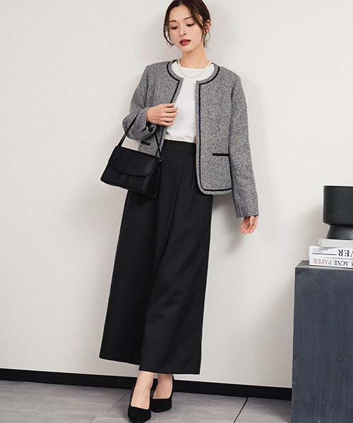 ジャケットはツイード素材が上品な印象を演出して、華やかなシーンにも最適。