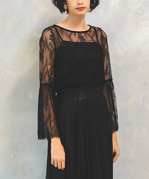 華奢なレースを使用したベルスリーブのブラウスとサテンのキャミソールがセットになった商品です。
