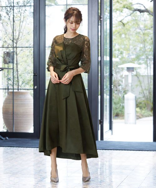 4. 【期間限定】【低身長対応】レース切替えビスチェ風フレアイレギュラーヘム結婚式ワンピースドレス