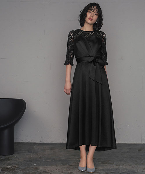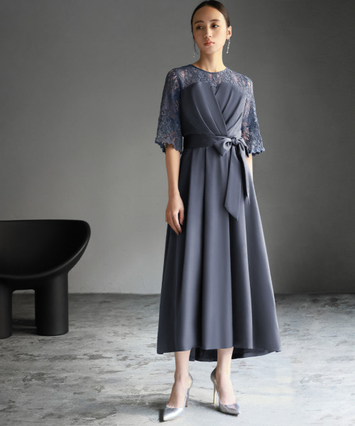 レースの程よい透け感とウエストリボンがレディーな印象のビスチェ風ミモレ丈フレアワンピース。