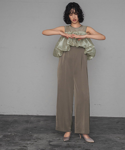 シフォンのボリュームトップスとオールインワンのセットアイテム。