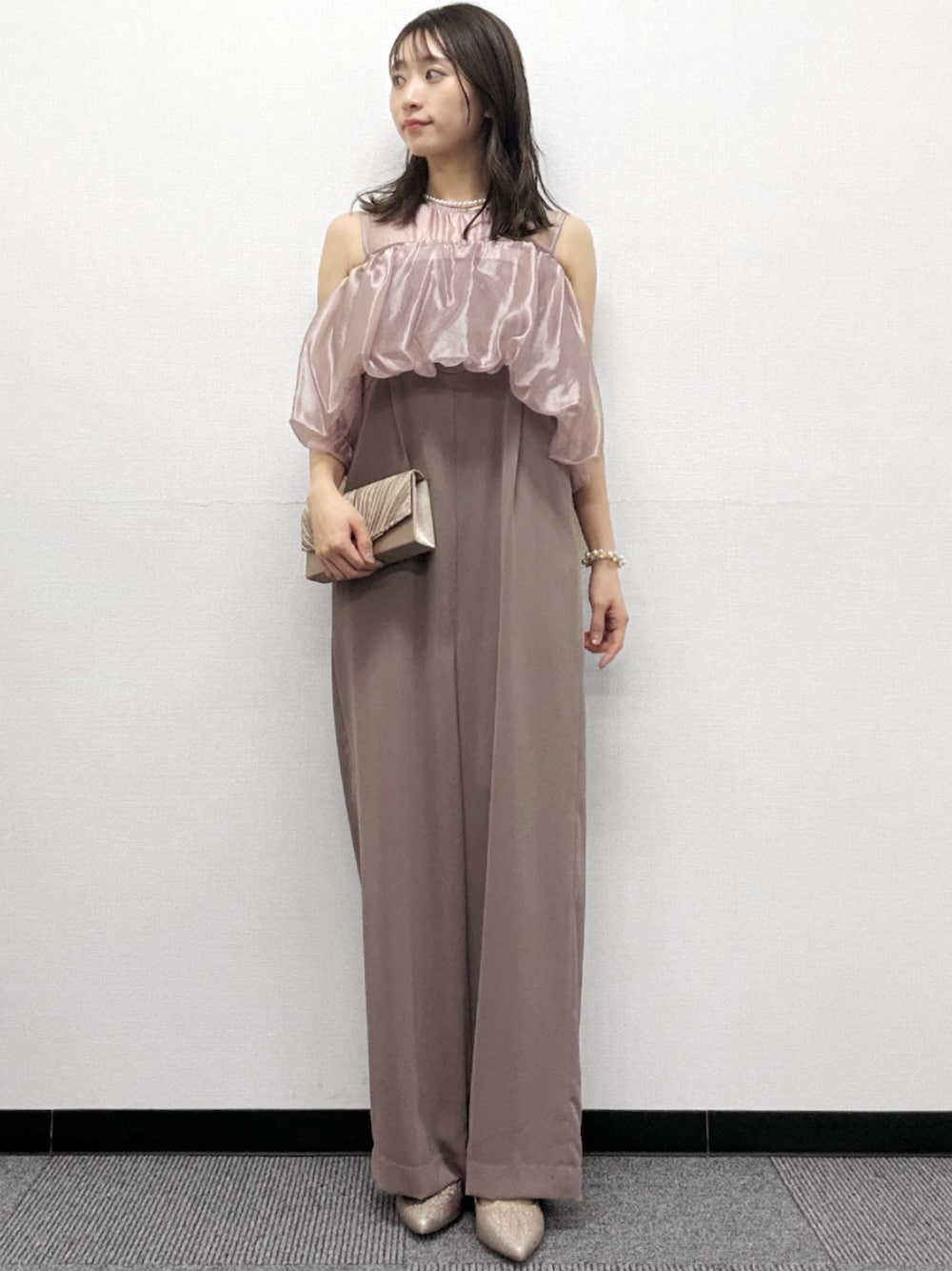 オールインワンは落ち感のある素材を使用しており、足の露出を控えつつフォーマルシーンでも品よく着られる1枚に仕上げました。