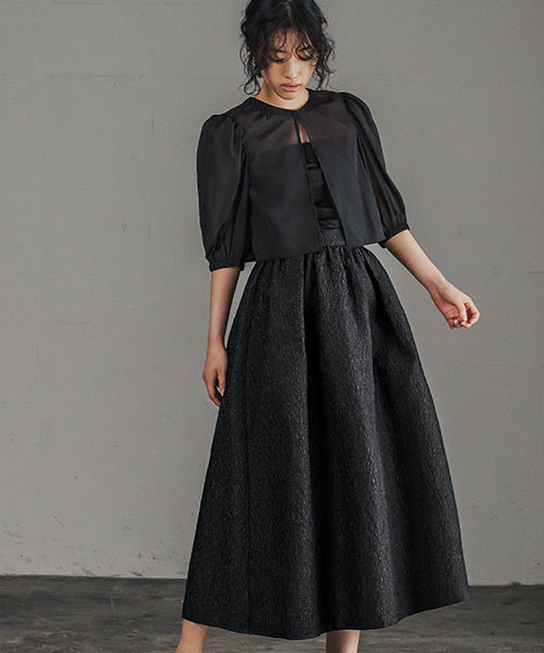 今季トレンドのシアー素材のパフスリーブブラウス、インナーチューブトップ、ジャガード素材のボリュームスカートの素敵で大人可愛い、大変お得なオケージョン3点セット。