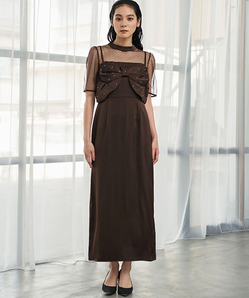 パールを使用したドット柄のリボンビスチェがアクセントのIラインドレスのセットになります。