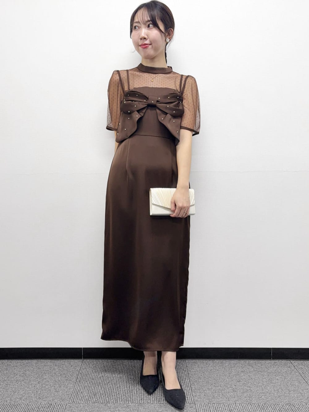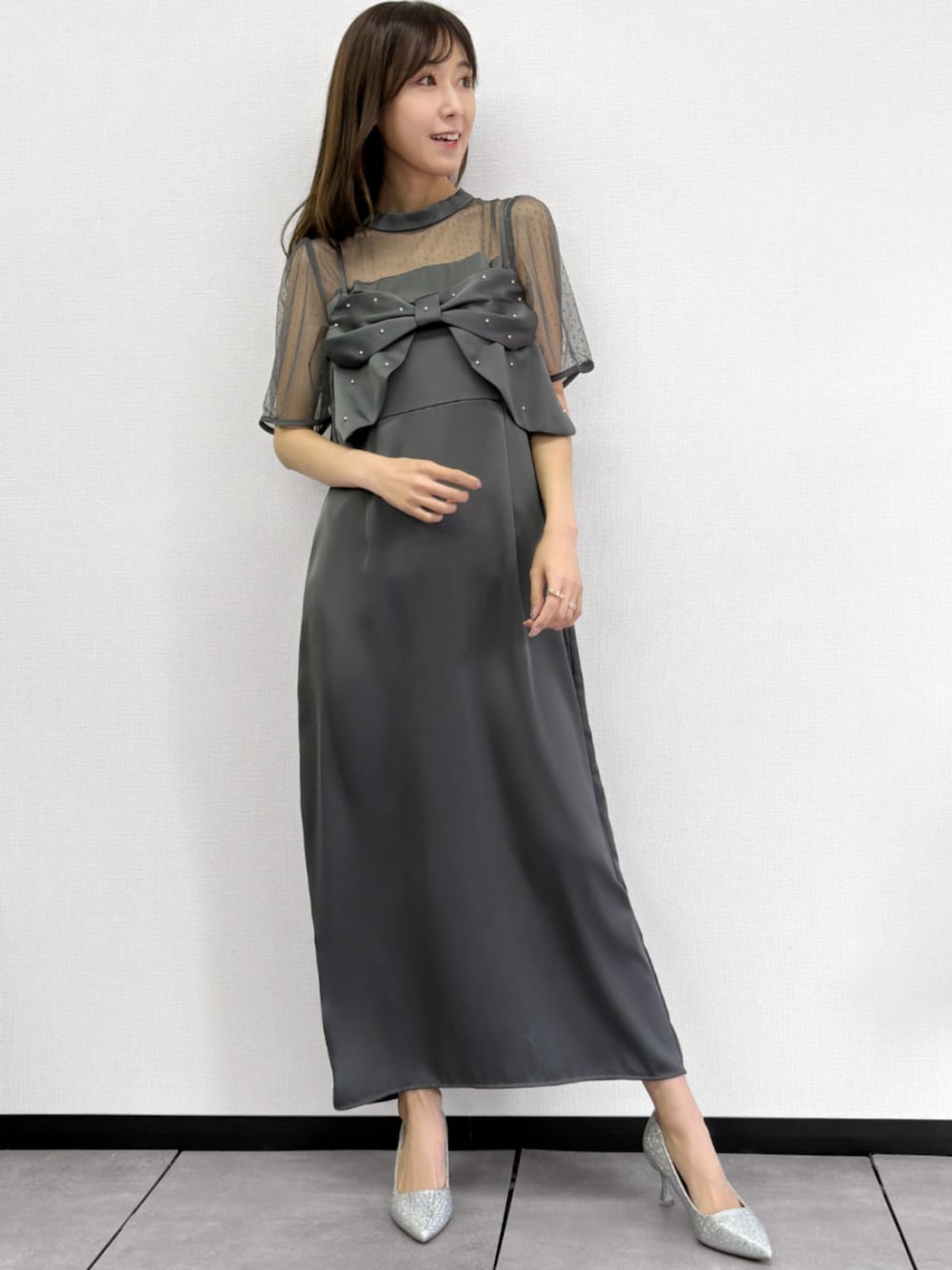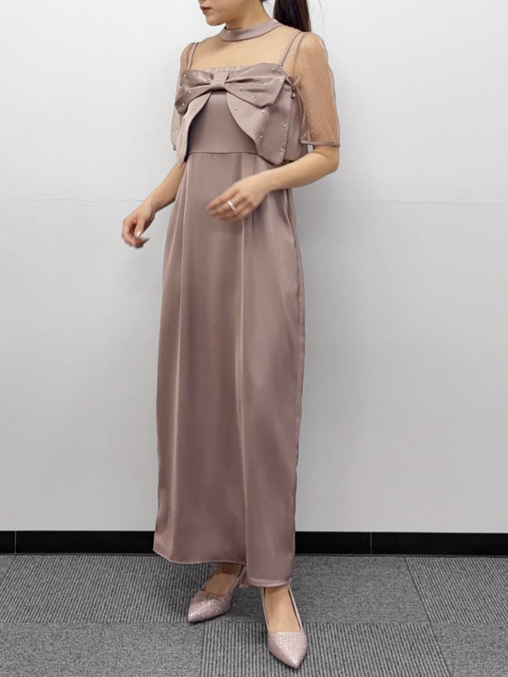 袖は程よい肌見せでエレガントな印象に仕上げ、透明感のあるドット柄のシースルーがドレスに抜け感を出してくれます。