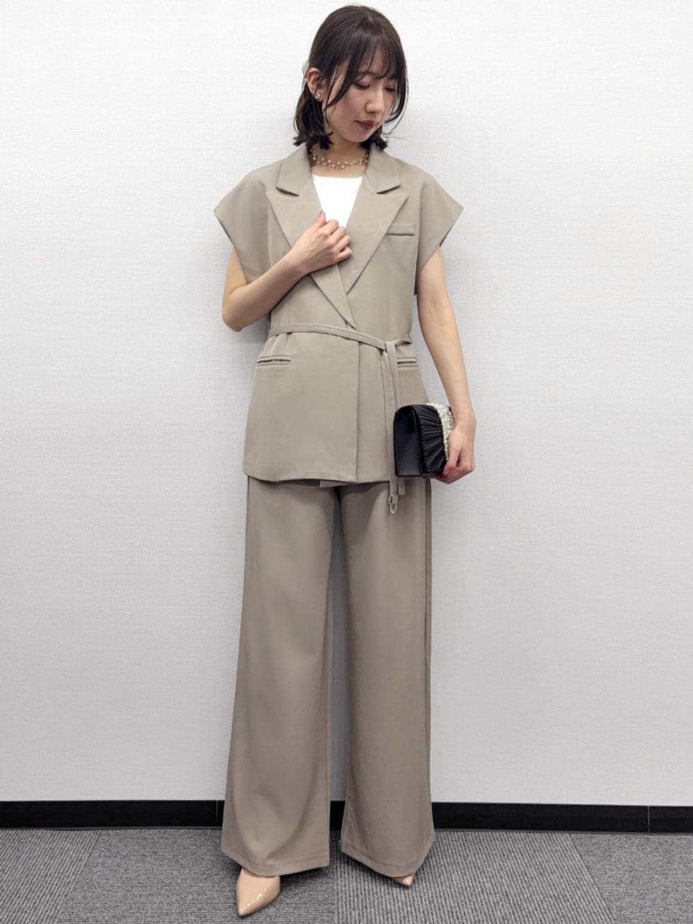 テーラードデザインのジレとパンツを組み合わせた、こなれ感のあるセットアップ。
