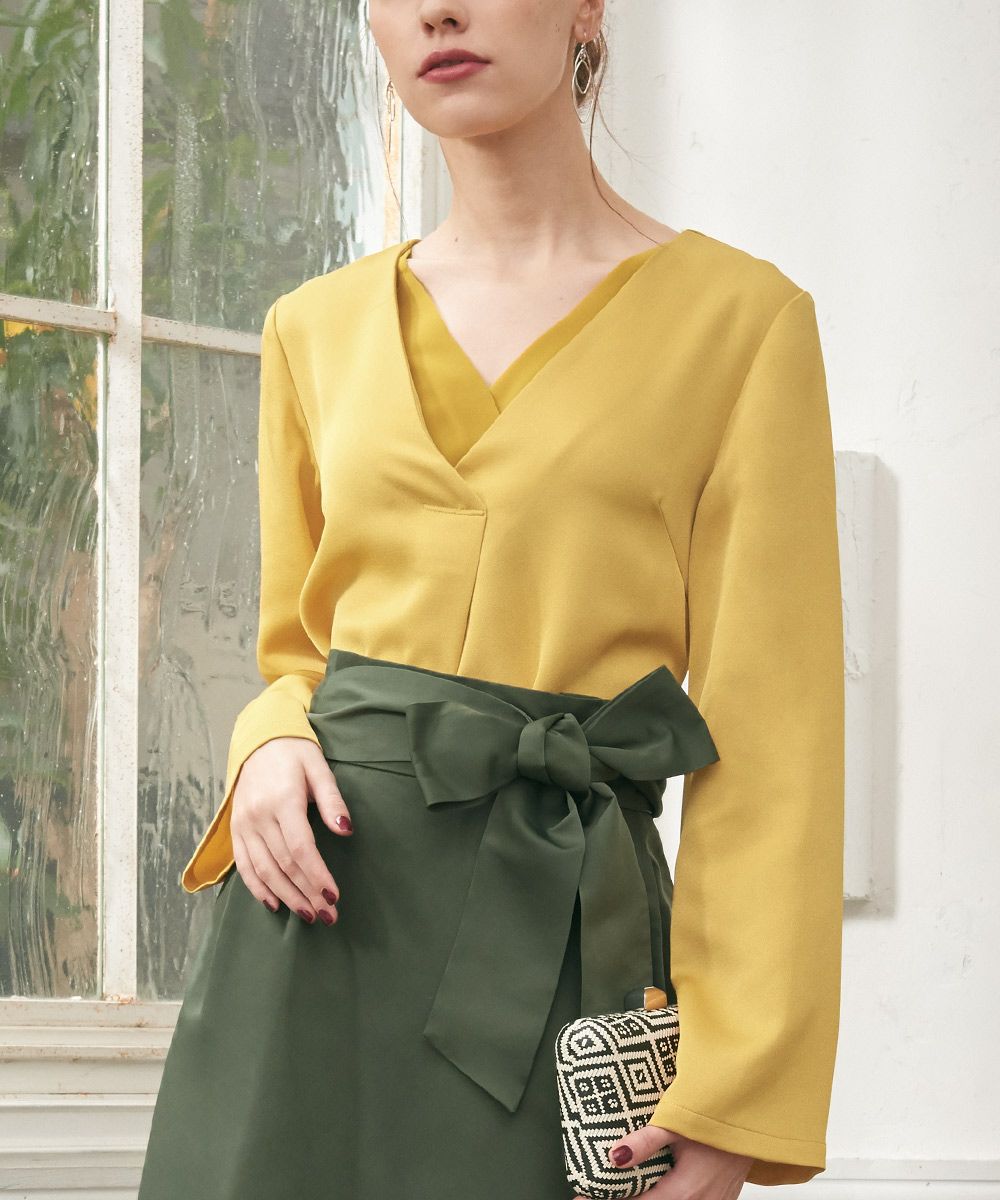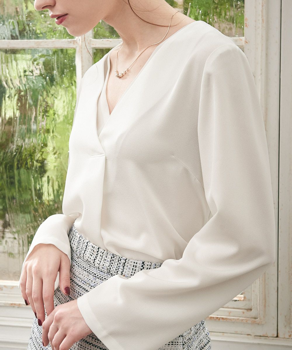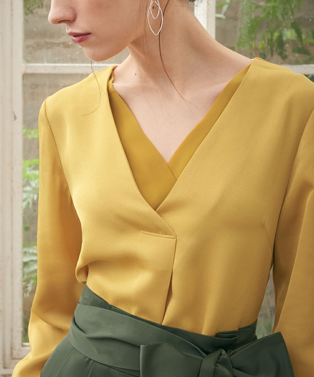 胸元のタックと二重に重なったVネックデザインがこなれた雰囲気を醸す異素材MIXのブラウス。