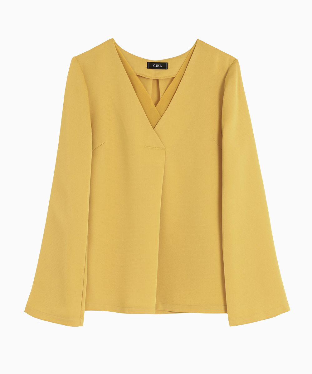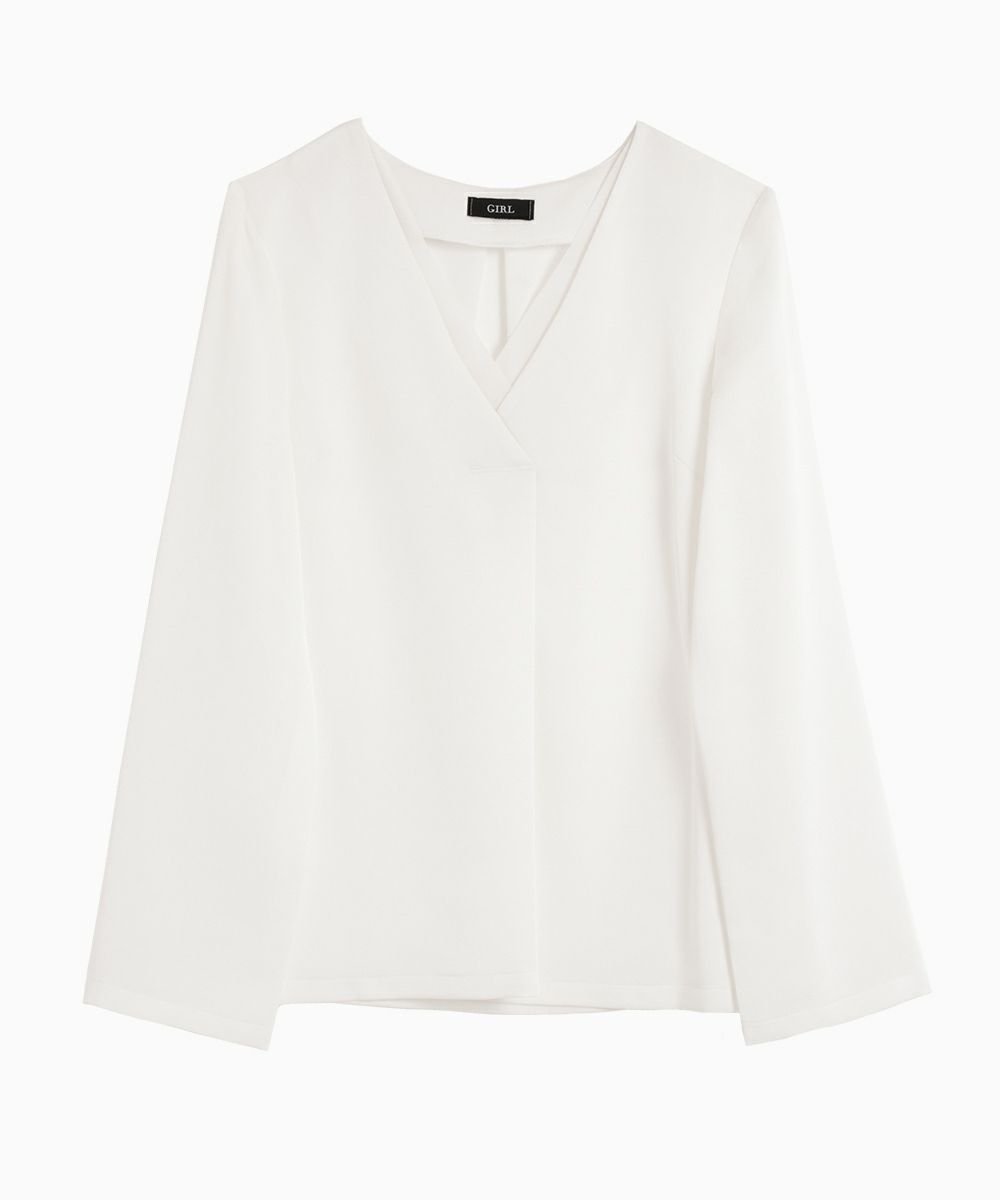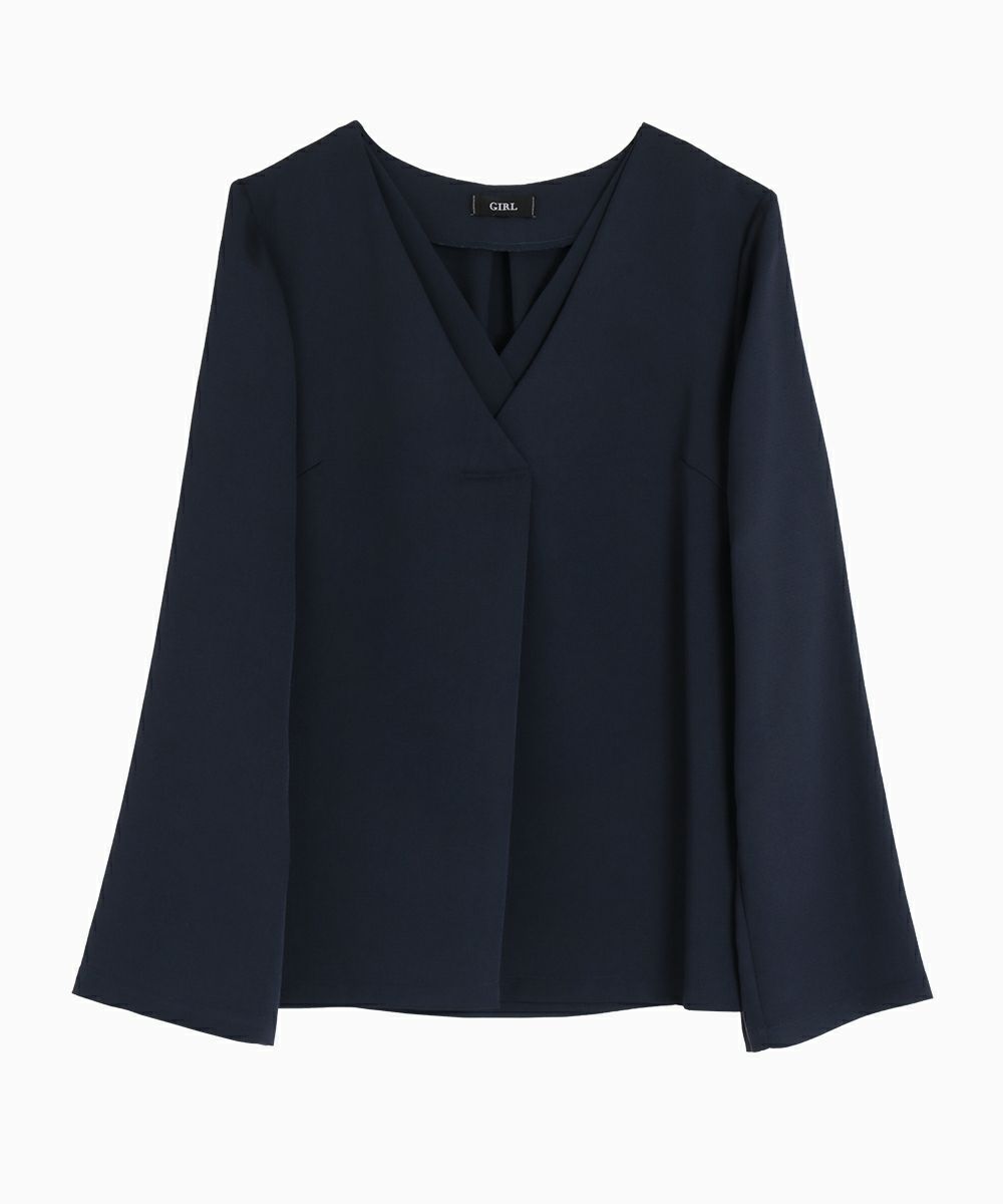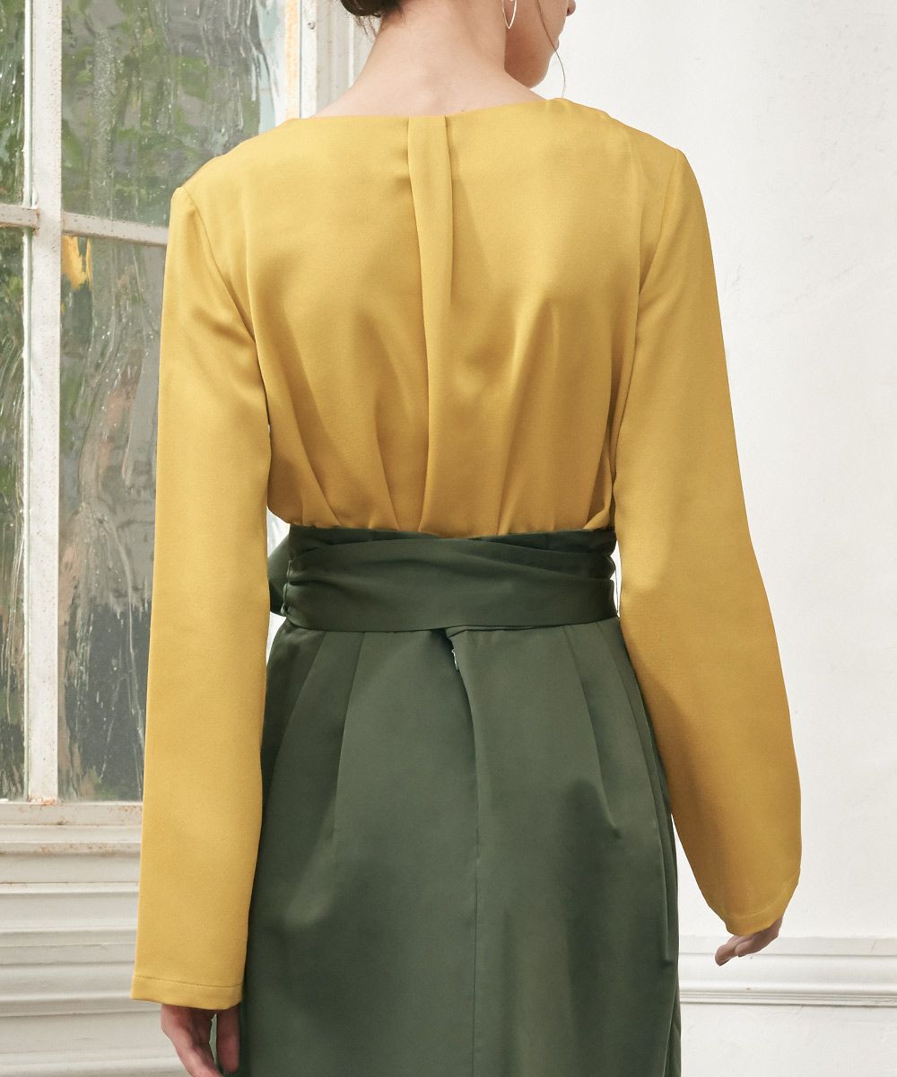 胸元のタックと二重に重なったVネックデザインがこなれた雰囲気を醸す異素材MIXのブラウス。