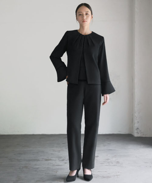 セットのストレートとのフルセットでブラックフォーマルとしてはもちろん、喪服・礼服や入学式(入園式)や卒業式(卒園式)などのセレモニーシーンやお子様のお受験にも。単品でオフィスカジュアル(ビジネスカジュアル)としてオフィスシーンにも活躍します。
