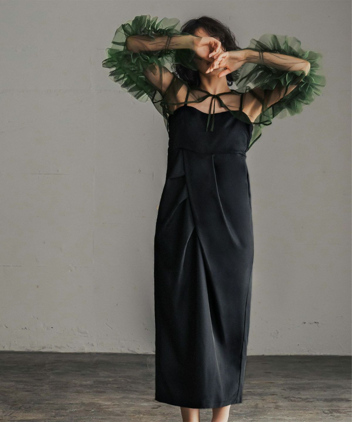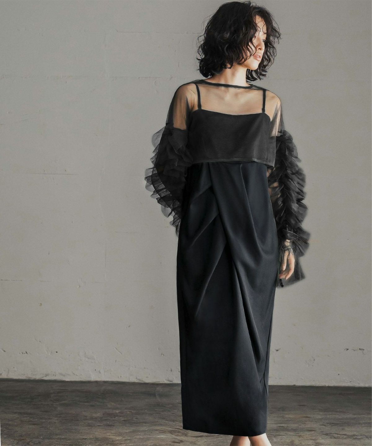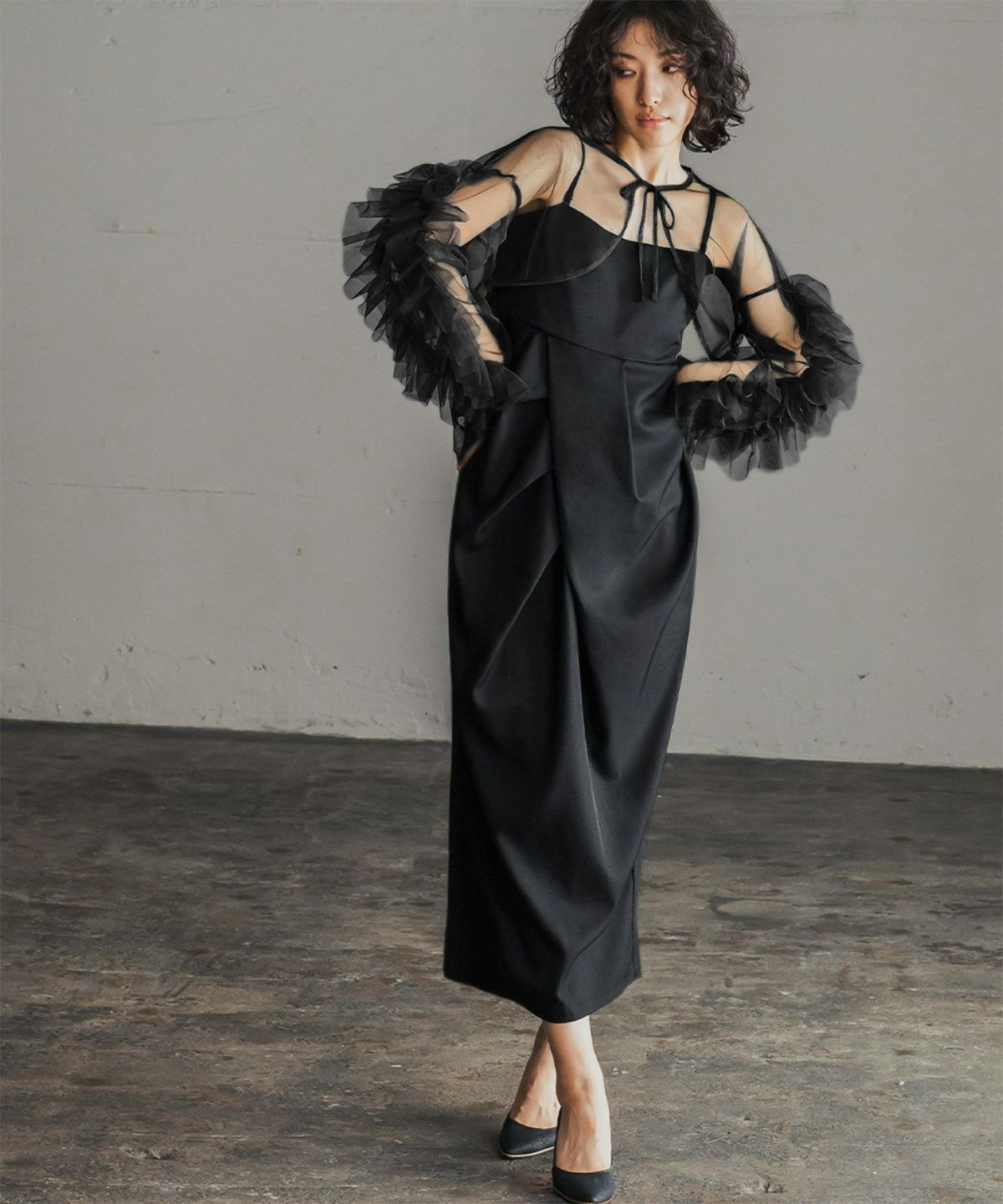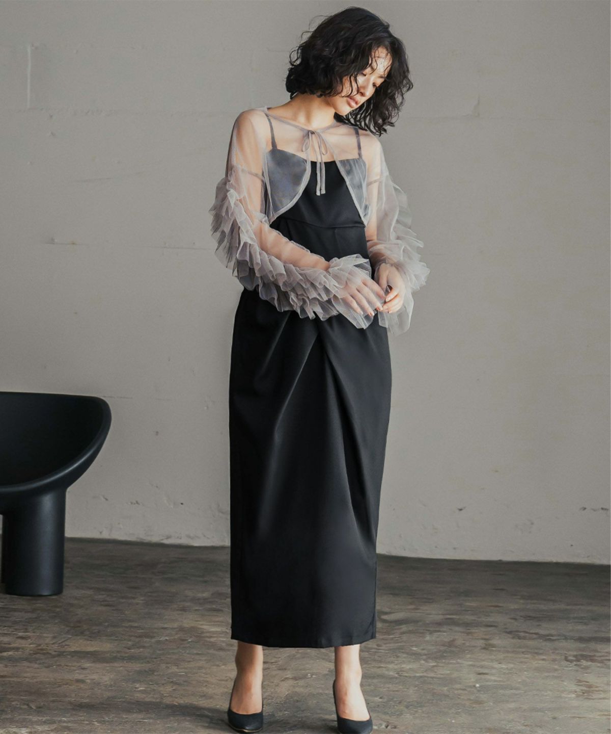 華やかさとエレガンスを兼ね備えたチュールフリルスリーブボレロとワンピースのセットアイテム。