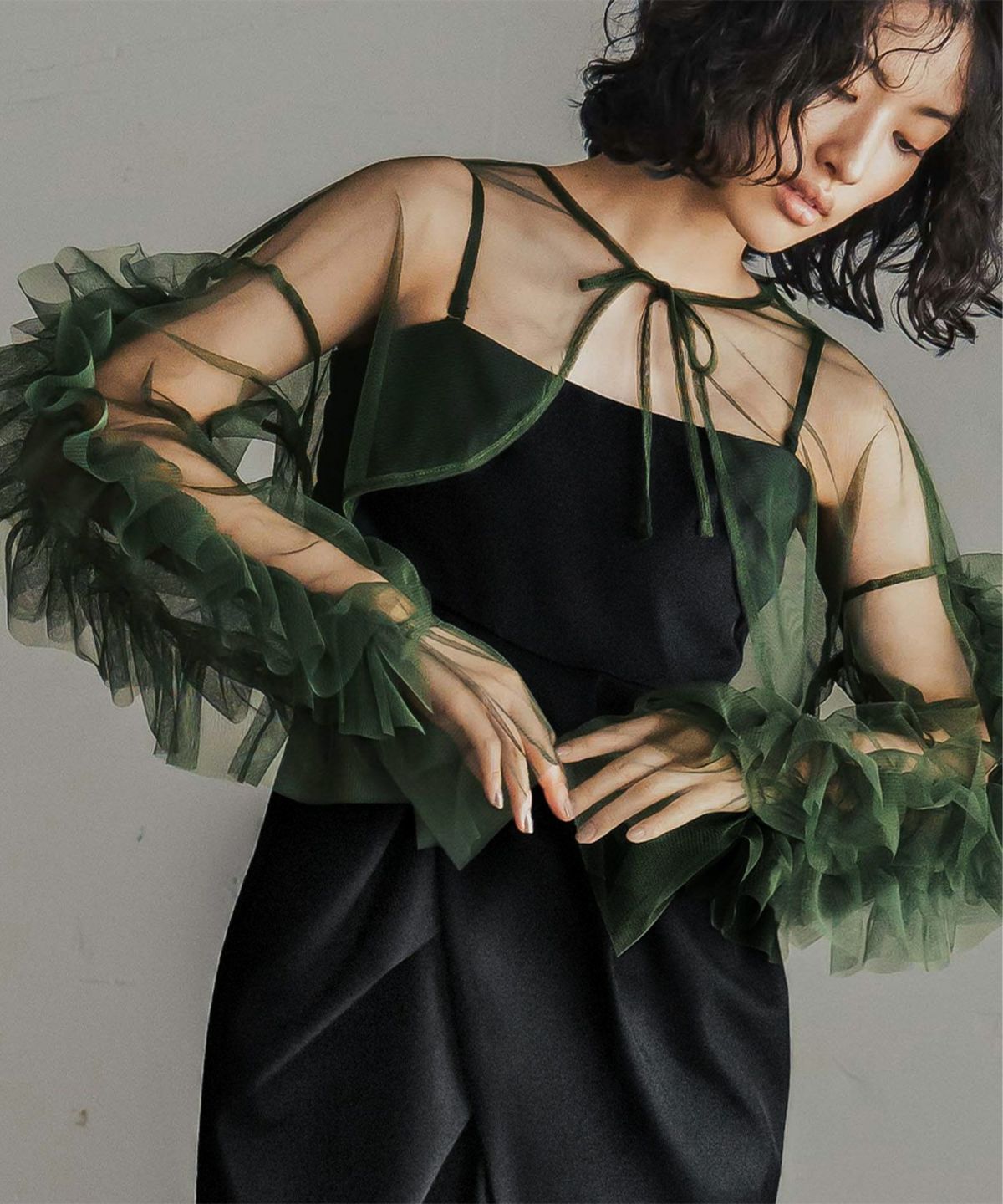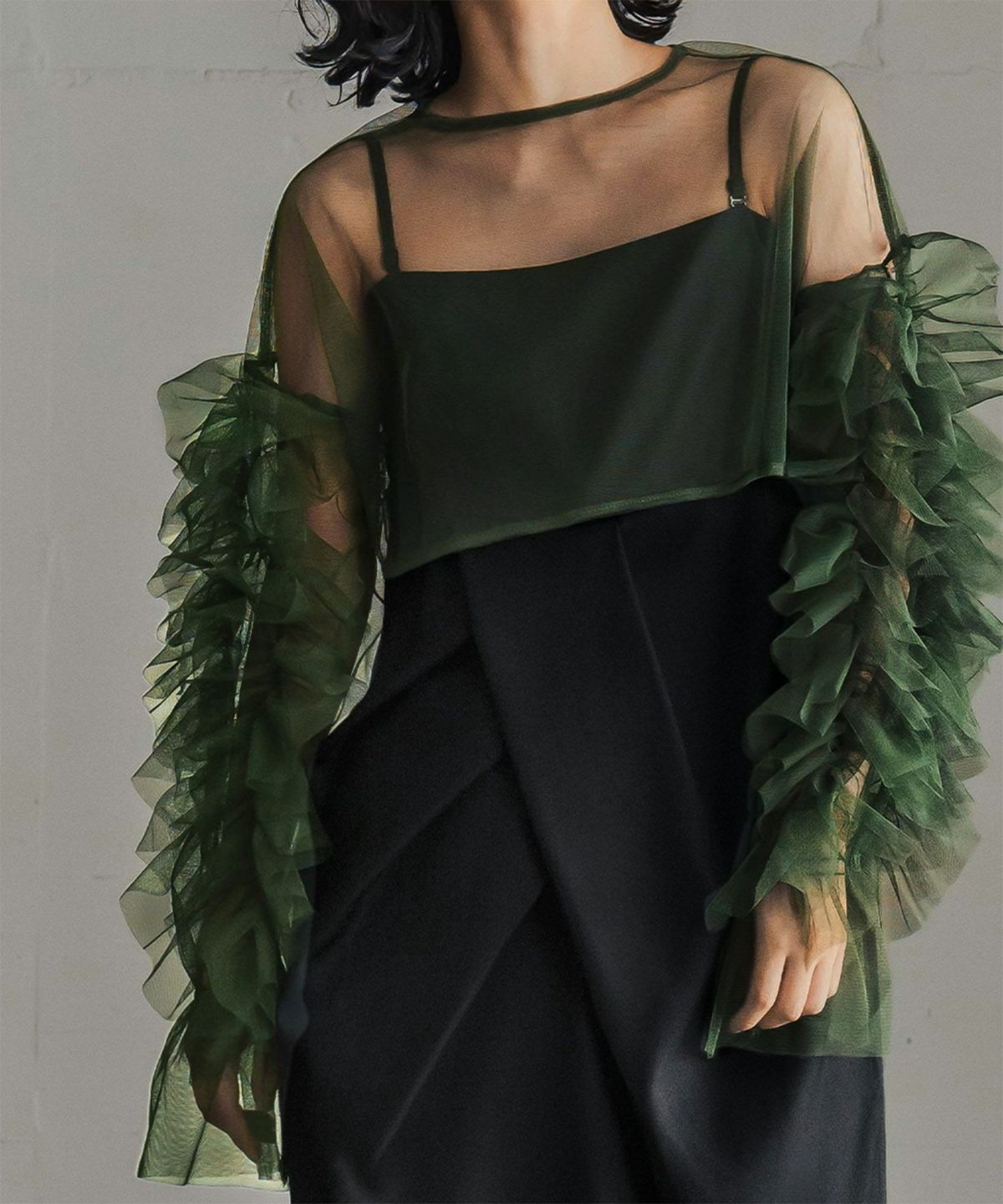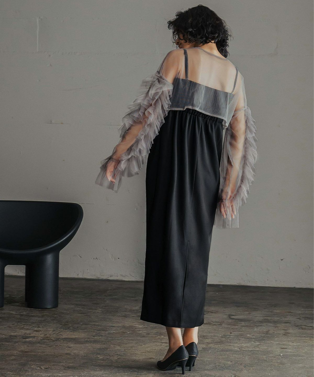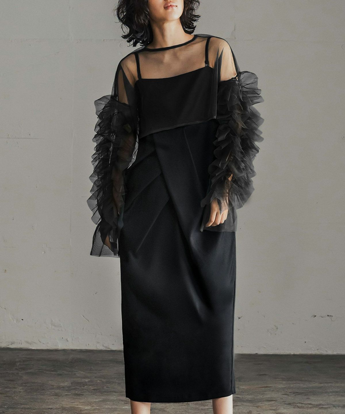 華やかさとエレガンスを兼ね備えたチュールフリルスリーブボレロとワンピースのセットアイテム。