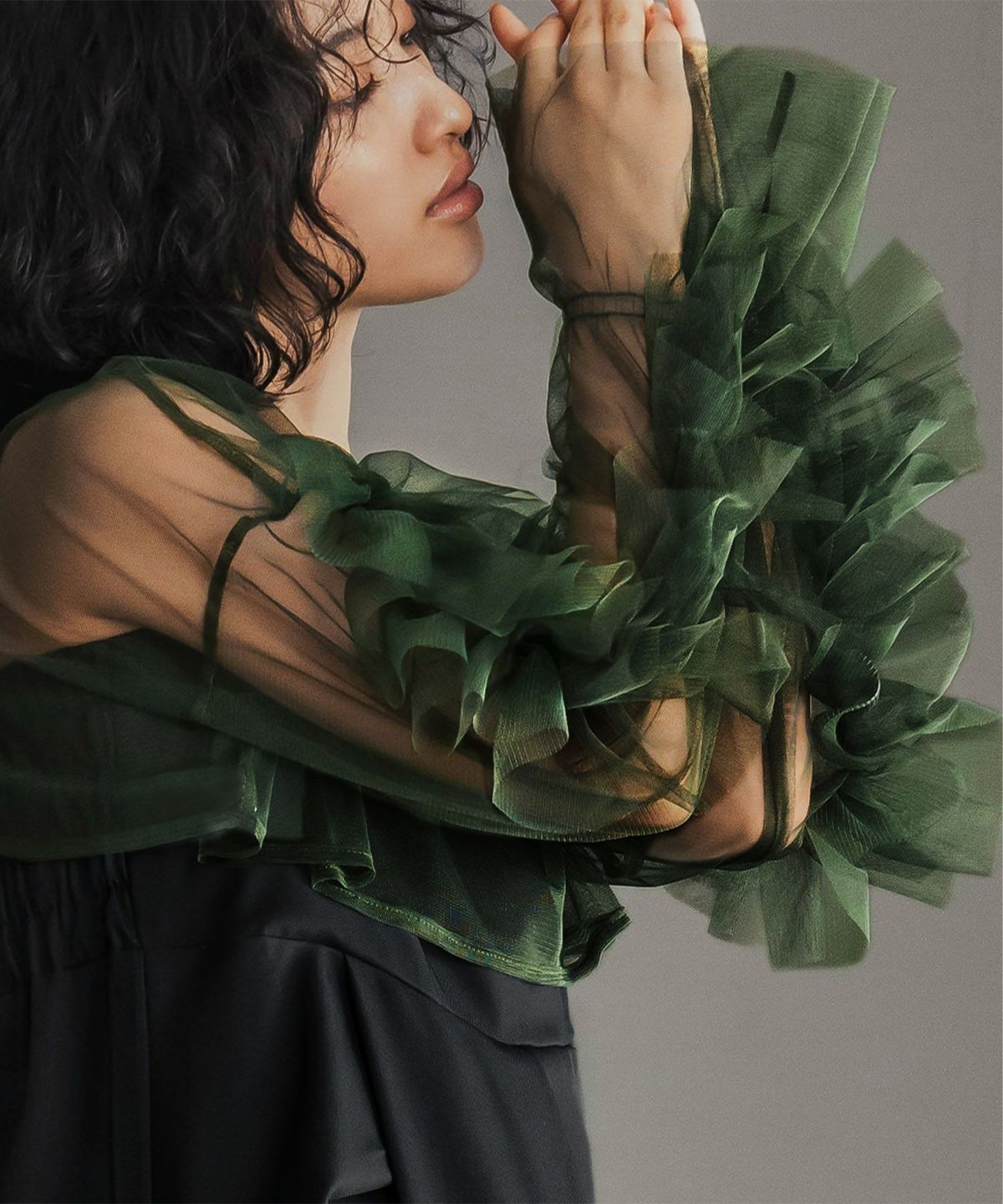 腕に施されたフリルが程よくボリュームを加え、腕を華やかにカバーしてくれます。