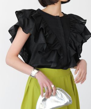綿麻混合の生地でとても着心地も良く洗濯しても麻素材が入っているのでシワシワになりません!あと二の腕をオシャレにフリルで隠せるのが素敵!色違いで全色揃えたいです♪